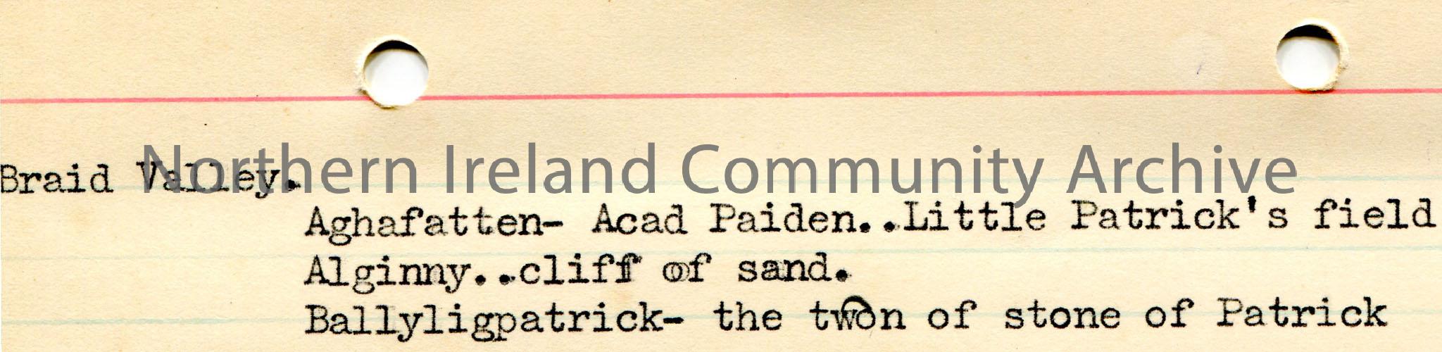 Typed notes on lined card re Braid Valley. Mentions Aghafatten, Alginny and Ballyligpatrick.