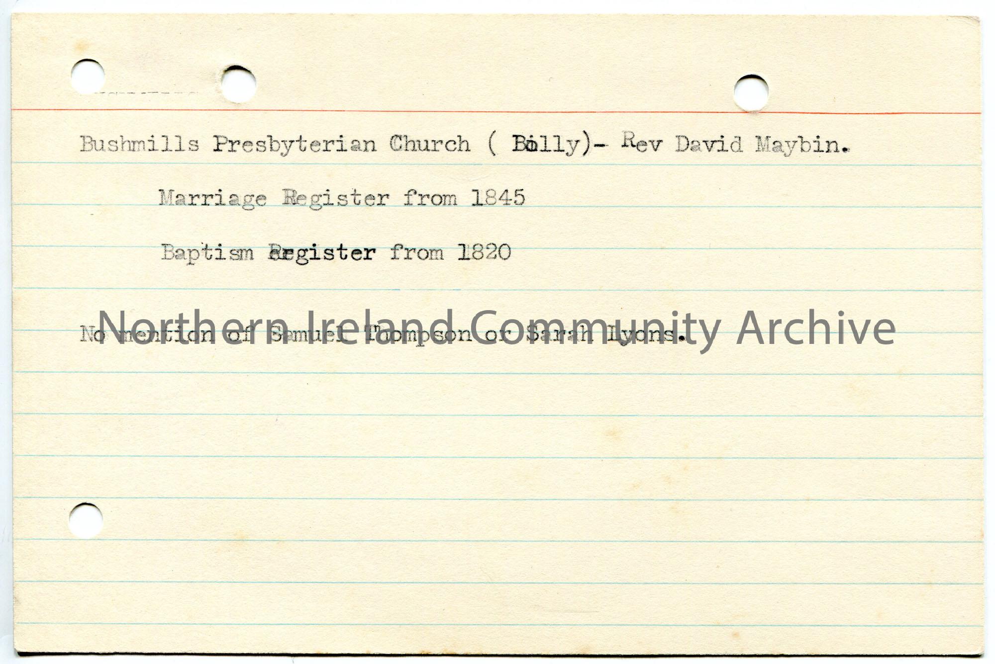 Typed notes on lined card re Bushmills Presbyterian Church. Research appears to have been carried out in the Marriage and Baptism registers for the names Samuel Thompson and Sarah Lyons. Refers to Rev David Maybin.