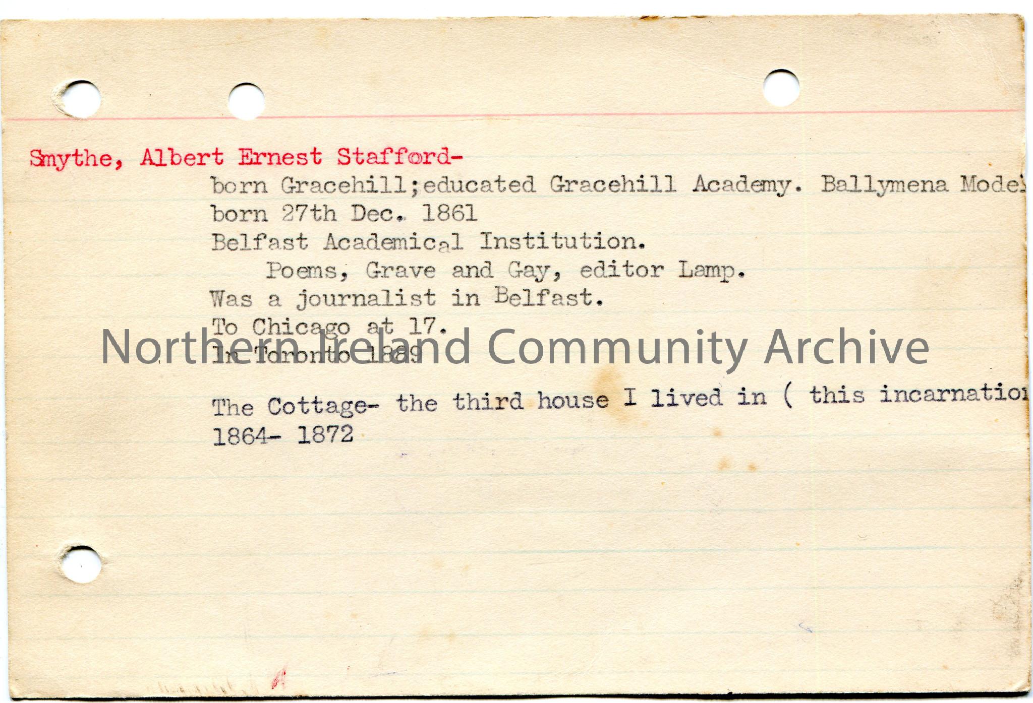Typed notes on lined card re career of Albert Ernest Stafford Smythe.