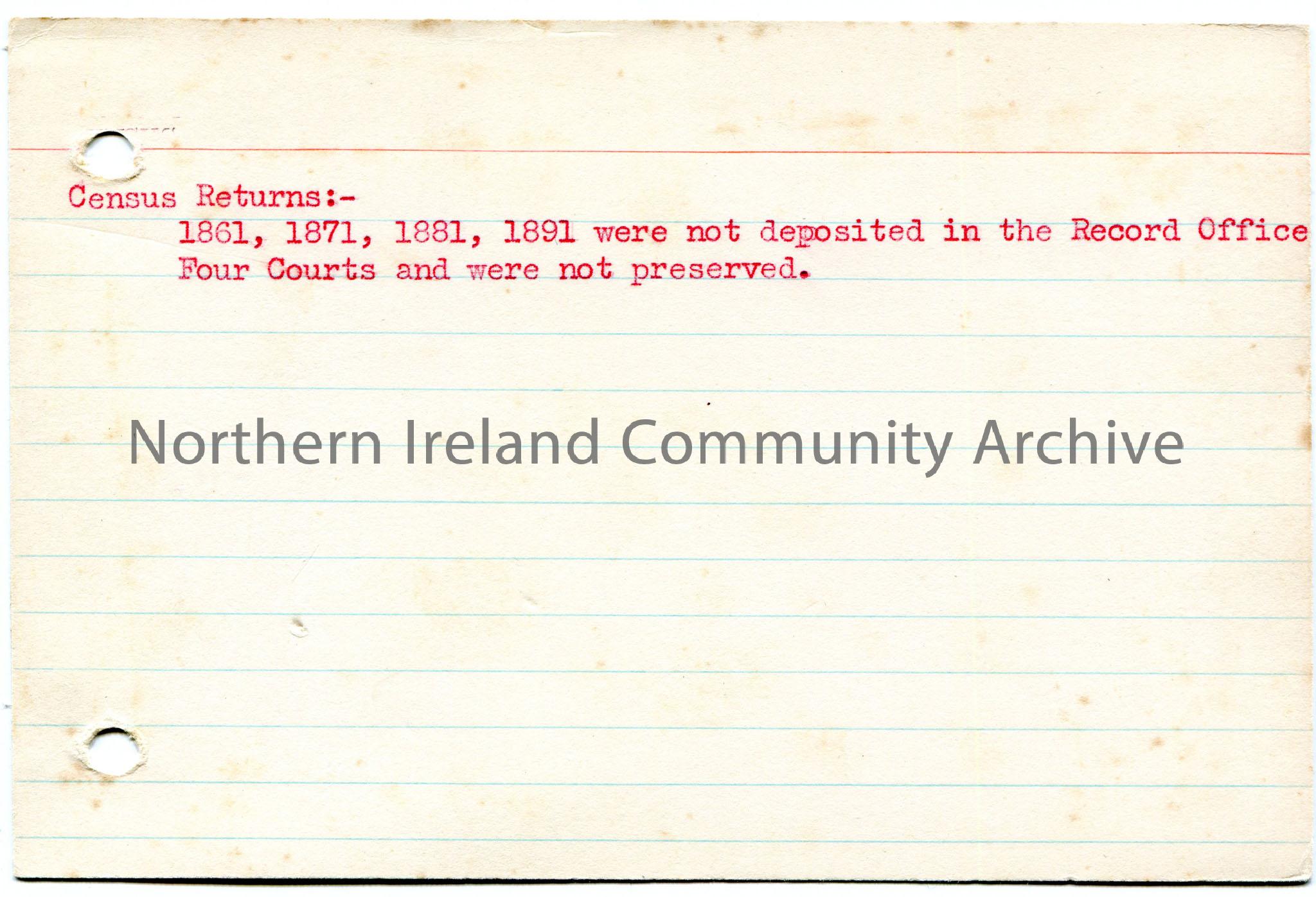 Typed notes on lined card re census returns of 1861,1871,1881 and 1891 were not preserved.