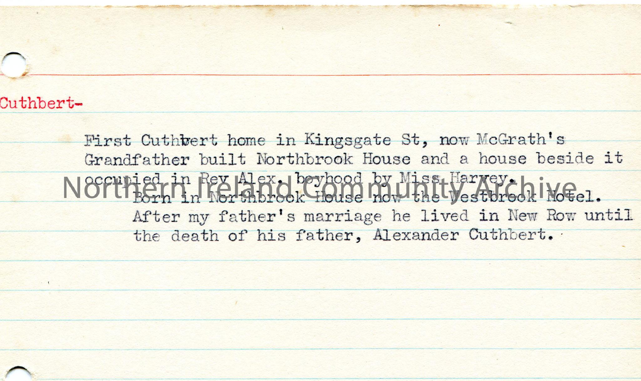Typed notes on lined card re Cuthbert home, Coleraine. Mentions Kingsgate Street, Northbrook House, Westbrook Hotel, New Row, Rev Alex, Miss Harvey, Alexander Cuthbert.