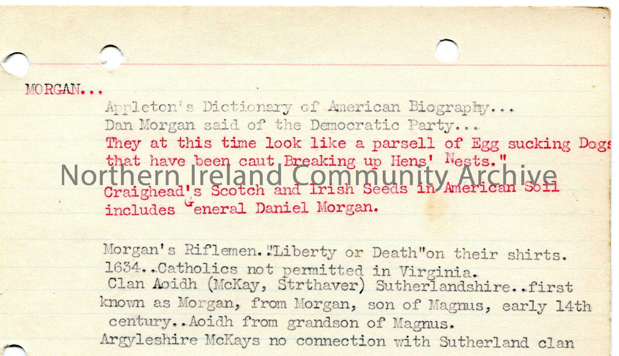 Typed notes on lined card re Dan Morgan.