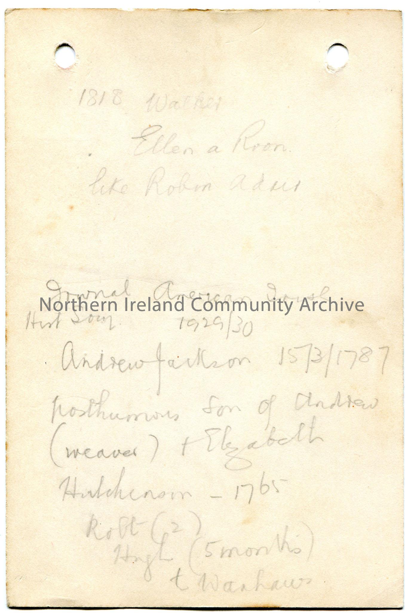 Typed notes on lined card re deed of James Thomson to Patterson in Book 178 - 330 - 119, 055. Handwritten notes in pencil re Andrew Jackson on back of card.