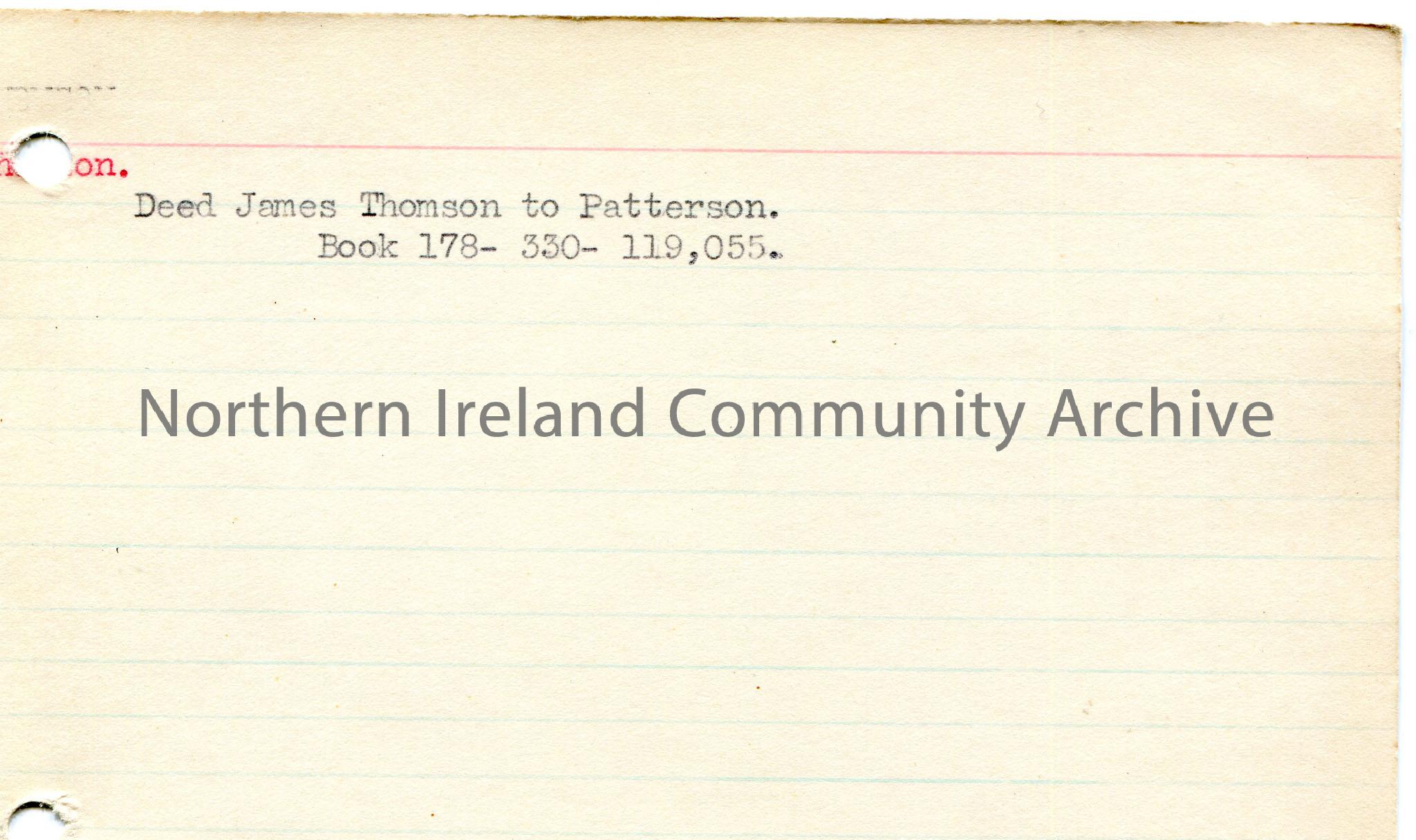 Typed notes on lined card re deed of James Thomson to Patterson in Book 178 - 330 - 119, 055. Handwritten notes in pencil re Andrew Jackson on back of card.