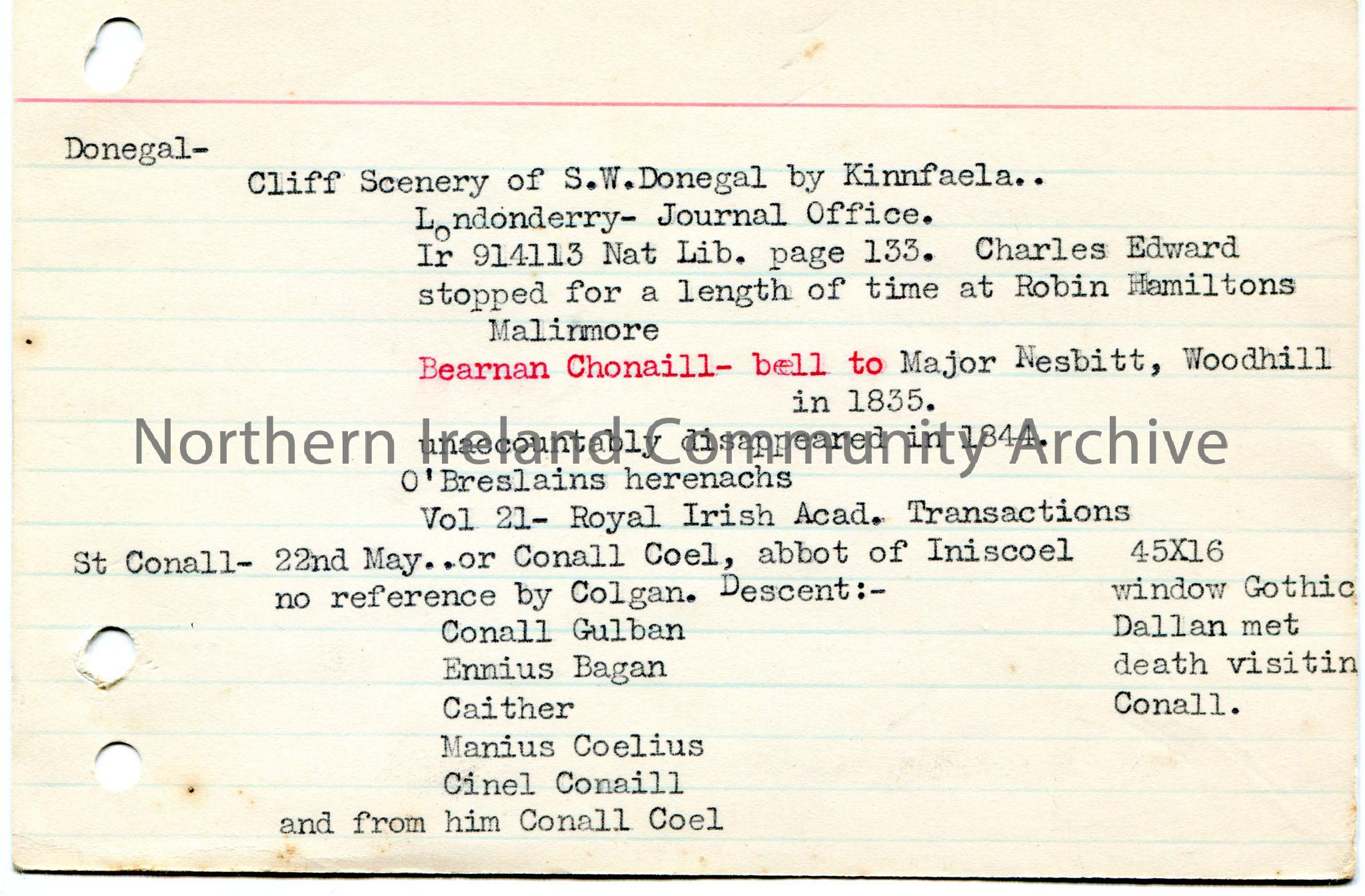Typed notes on lined card re Donegal and St Conall. Mentions Charles Edward, Robin Hamiltons, Malinmore, Major Nesbitt. Mentions dates 1835 and 1844.