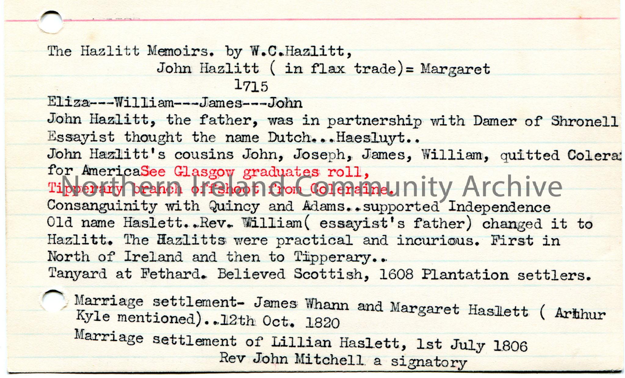 Typed notes on lined card re family name Hazlitt/Haslett. Genealogical research.