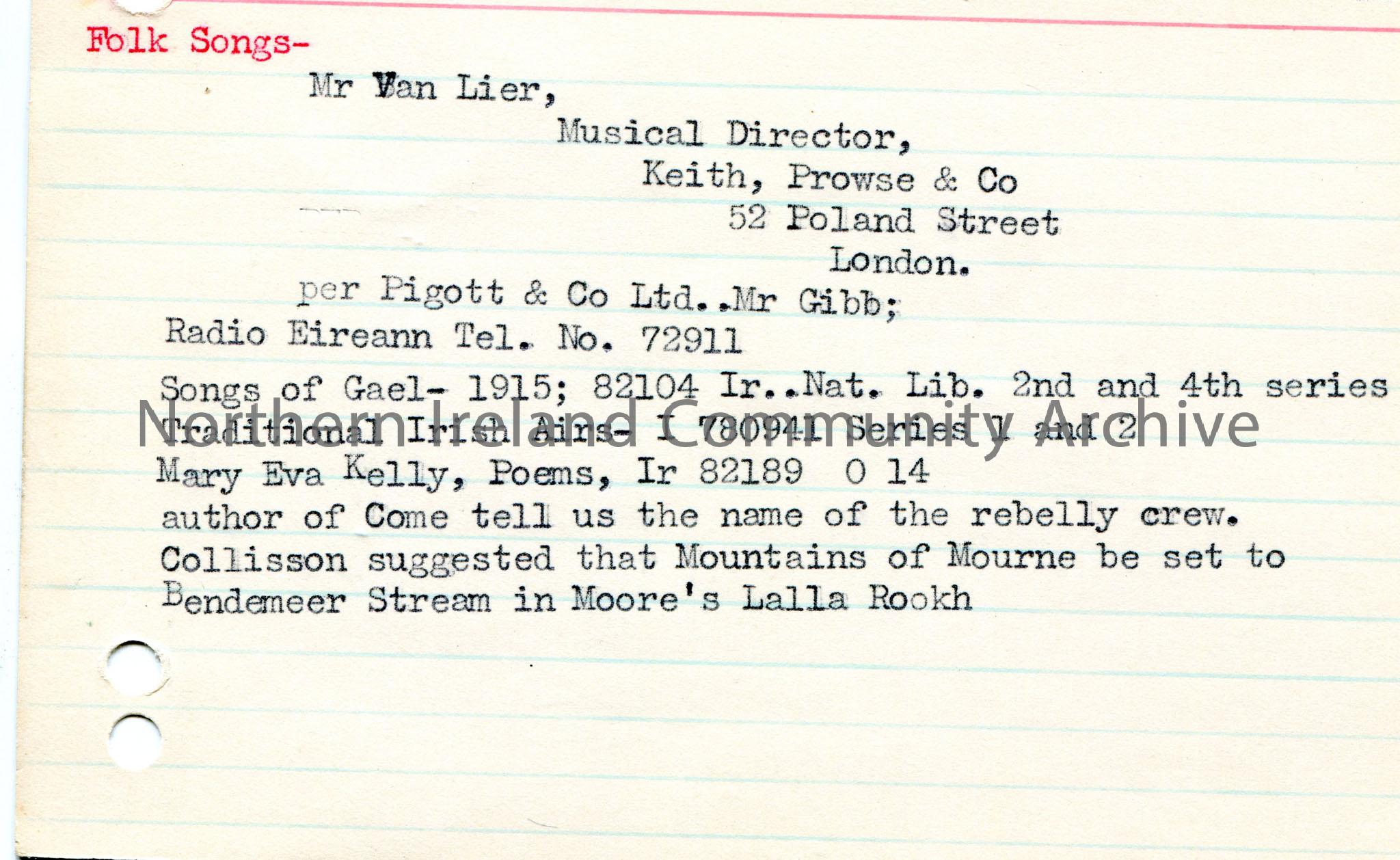 Typed notes on lined card re folk songs. Refers to Mr Van Lier, London, Pigott & Co Ltd, Radio Eireann, Mary Eva Kelly.