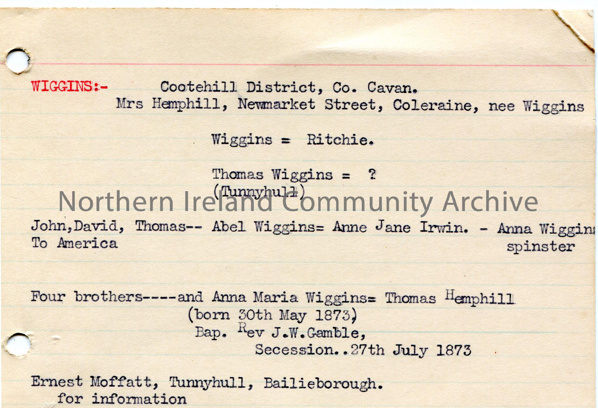 Typed notes on lined card re genealogical information on the surname Wiggins. Mentions Coleraine.