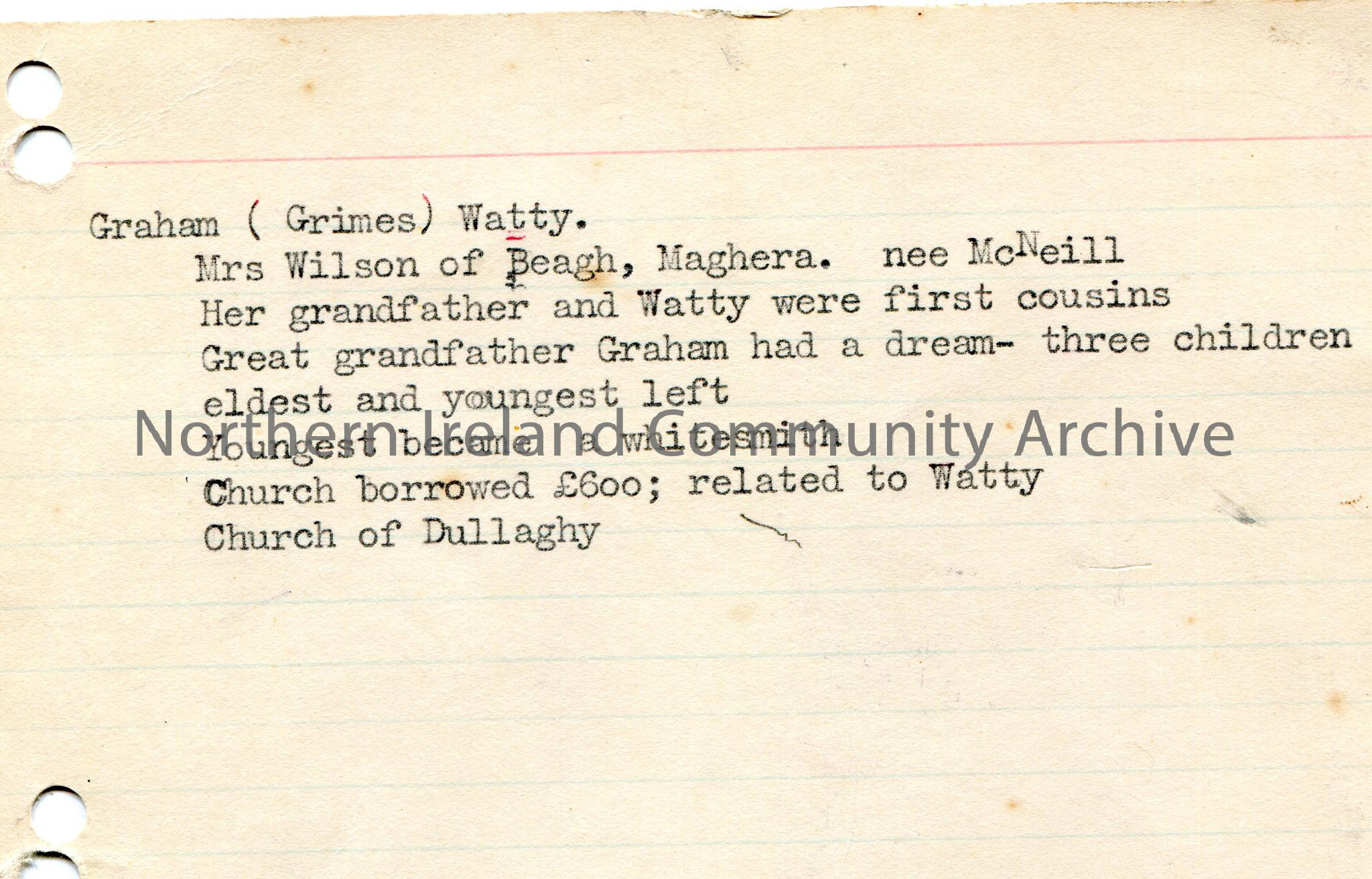 Typed notes on lined card re genealogical information re Graham (Grimes) Watty.