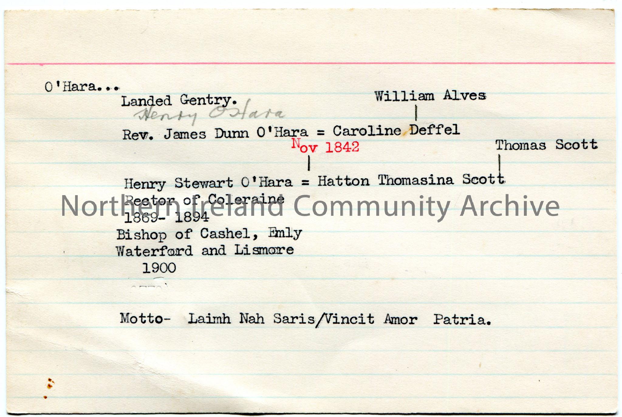 Typed notes on lined card re genealogical information re surname O’Hara. Mentions Coleraine.