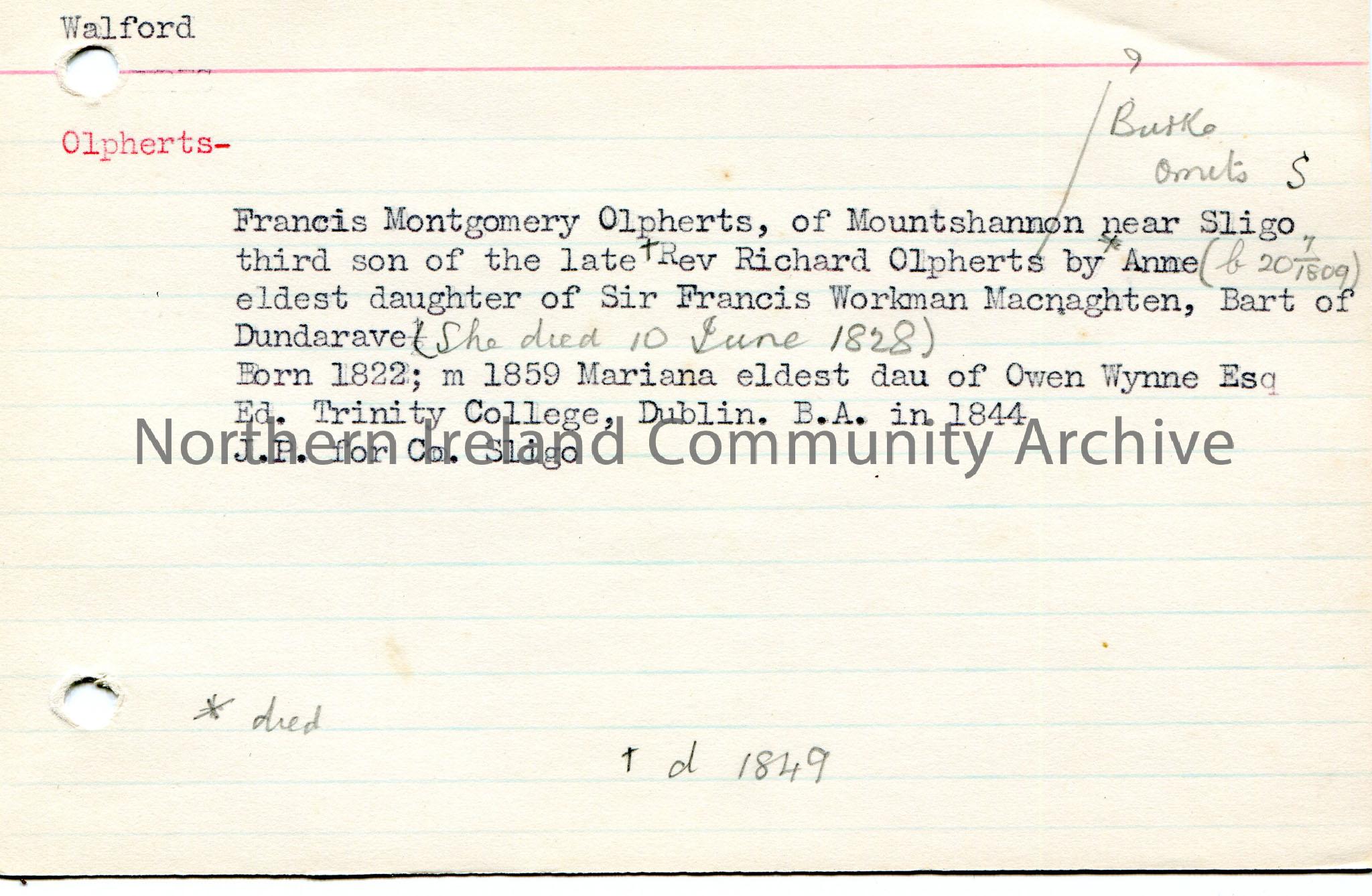 Typed notes on lined card re genealogical research on Francis Montgomery Olpherts of Mountshannon near Sligo. Annotated in pencil.
