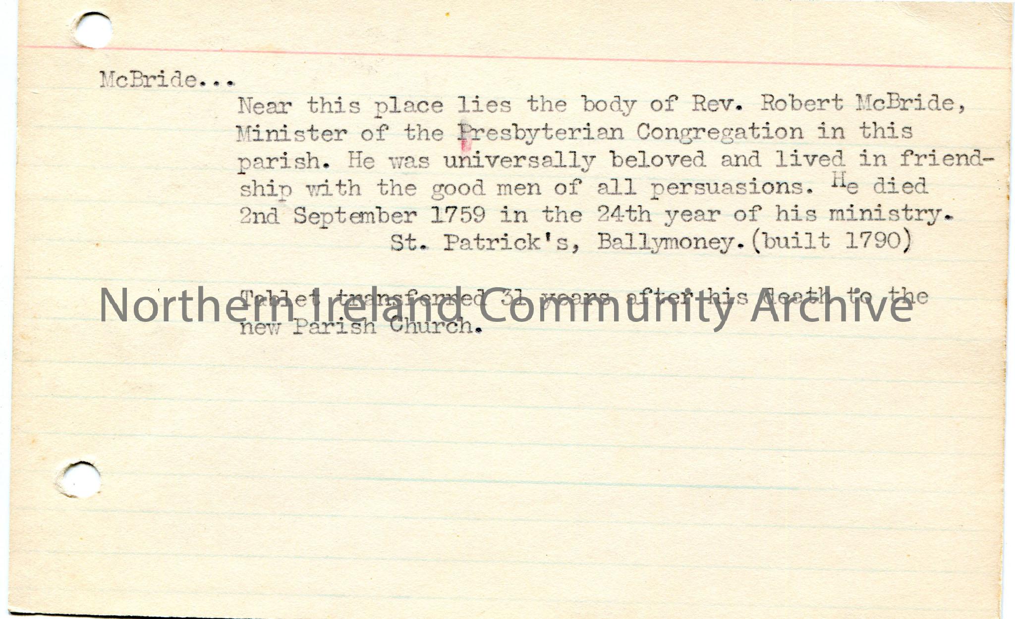 Typed notes on lined card re information on death of Rev Robert McBride.