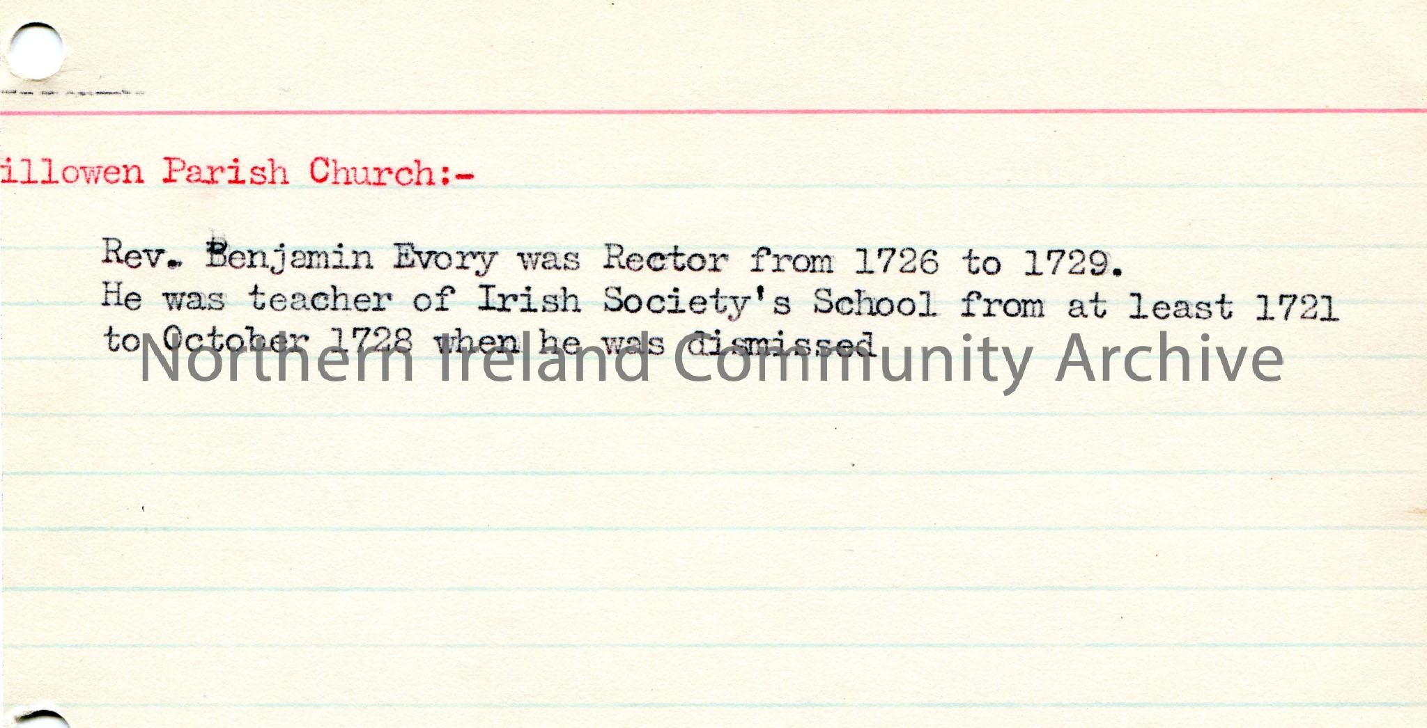 Typed notes on lined card re Killowen Parish Church. Mentions Rev Benjamin Evory as Rector.