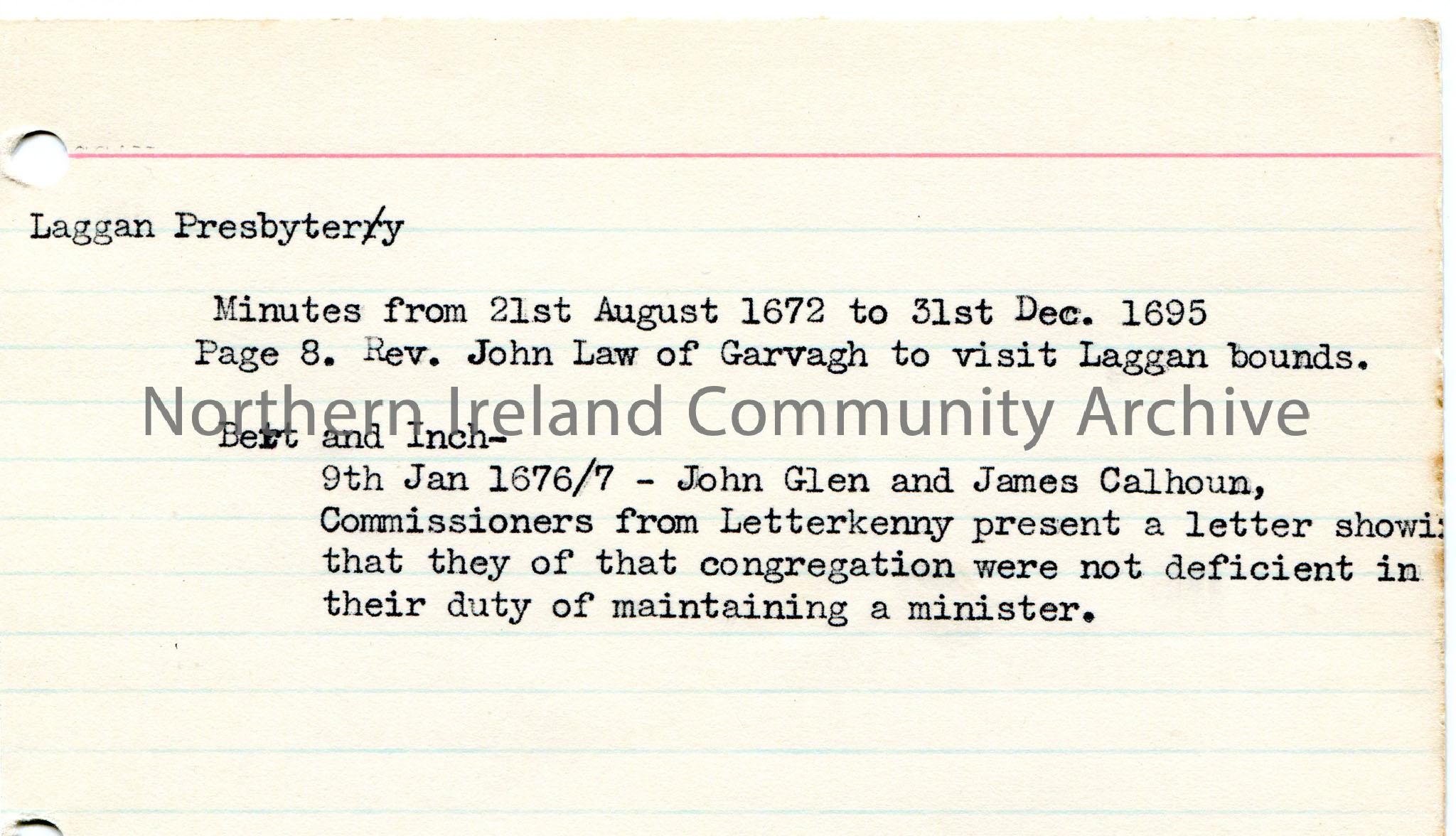 Typed notes on lined card re Laggan Presbytery. Extract of minutes 1672-1695. Mentions John Glean and James Calhoun.