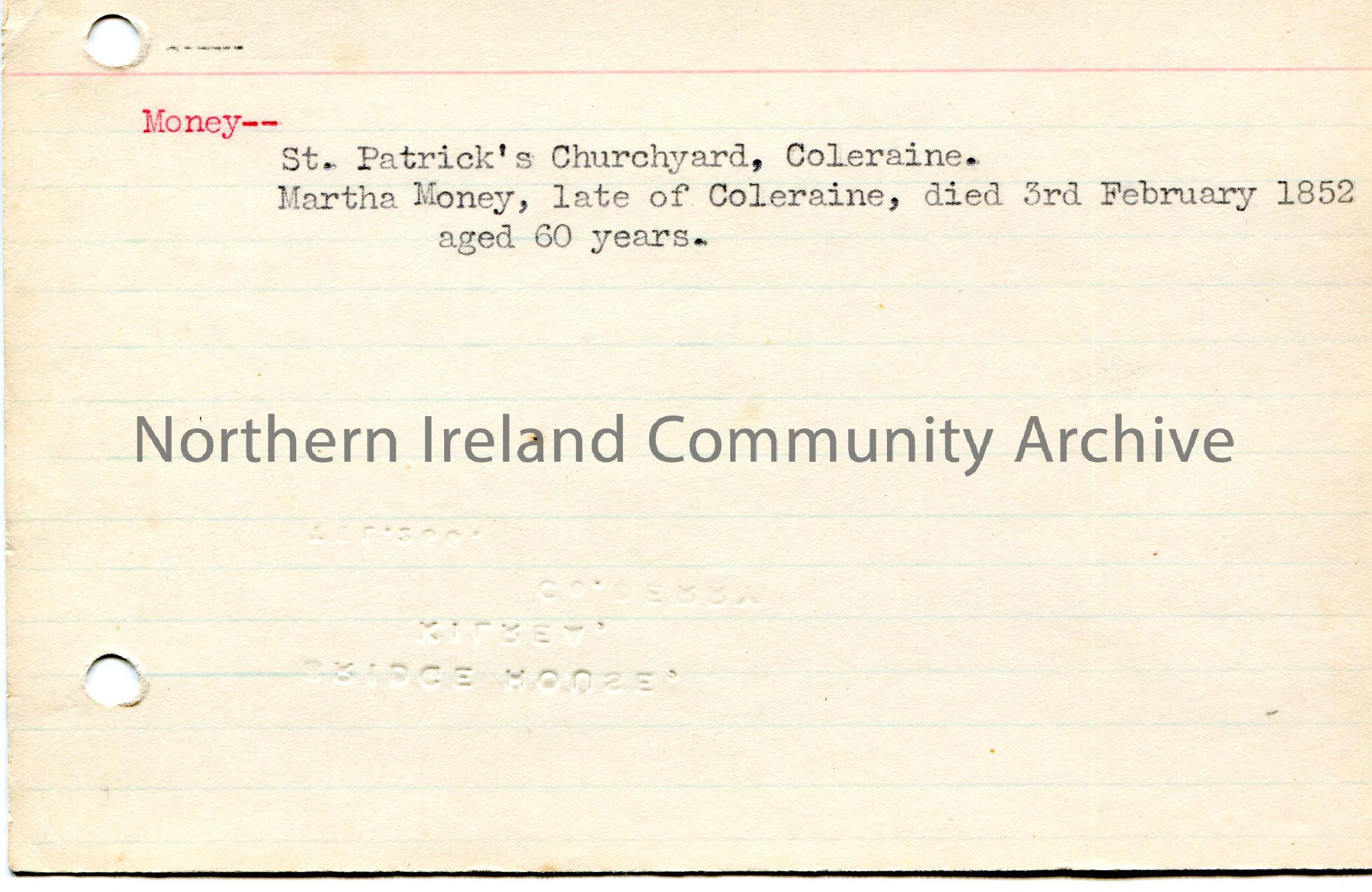 Typed notes on lined card re Martha Money of Coleraine. Address of Bridge House, Kilrea, Co. Derry embossed on other side of card.