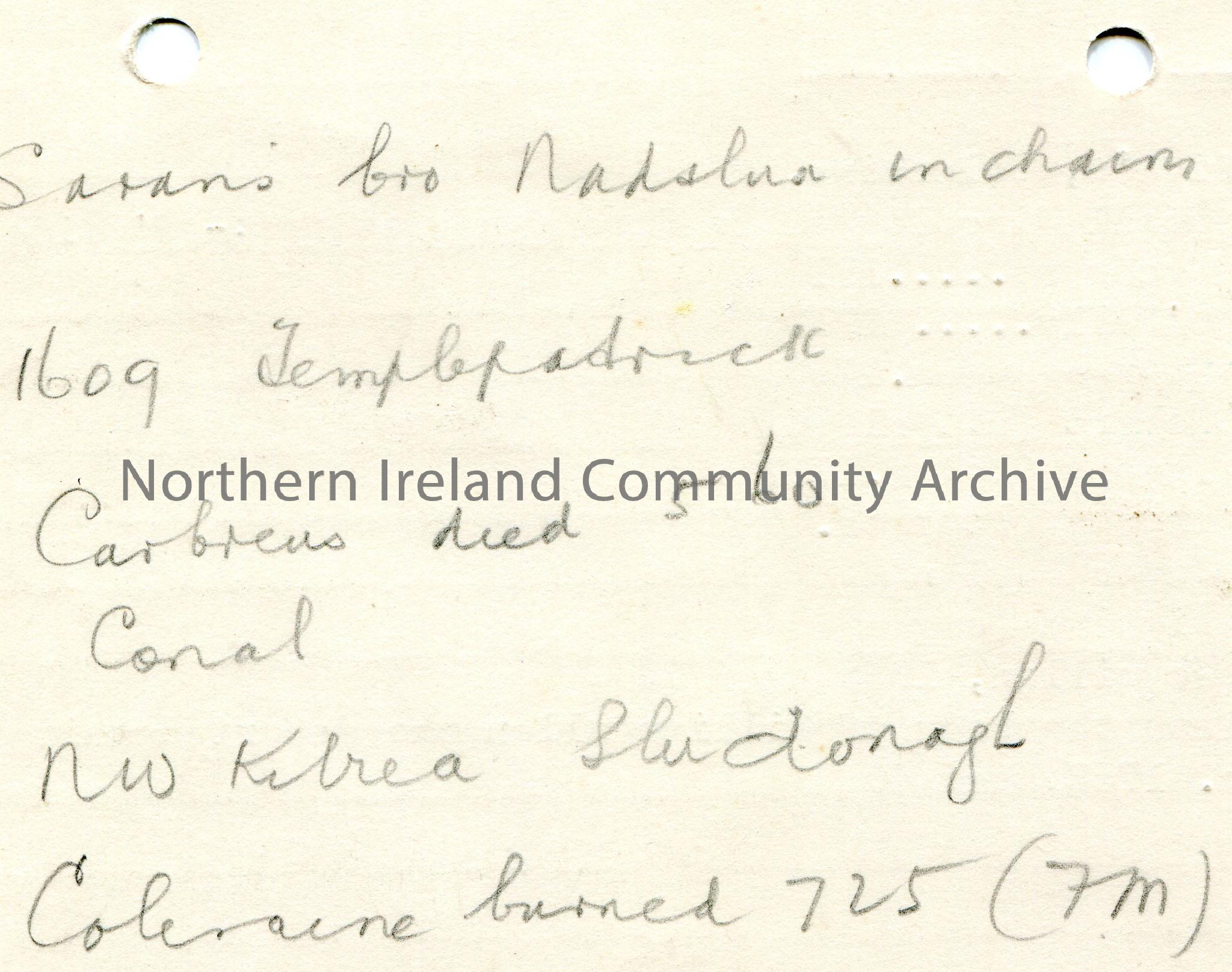 Typed notes on lined card re names on headstones in St. Patrick’s, Coleraine. Mentions Cochrane, O’Kelly, Dugan, Fulton, Clelan, Paterson, Boylan, Lon… – scan626h