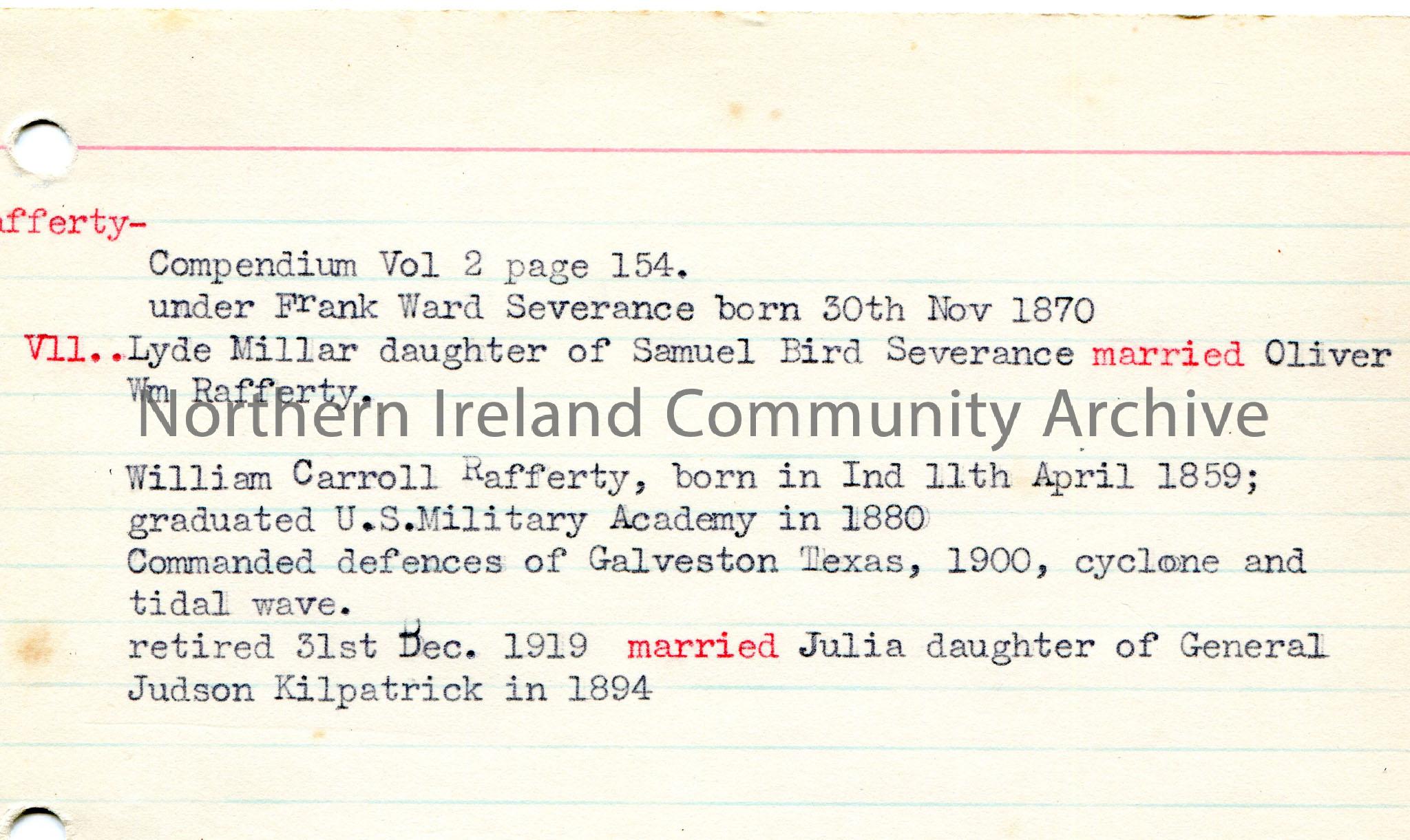Typed notes on lined card re Oliver William Rafferty and William Carroll Rafferty.
