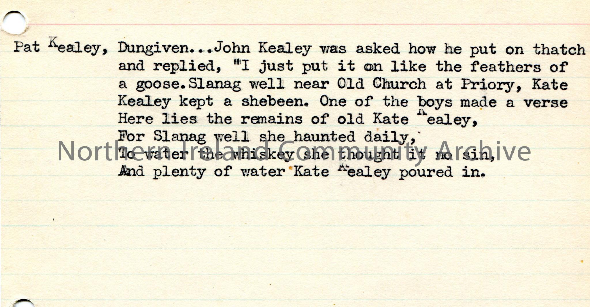 Typed notes on lined card re Pat Kealey of Dungiven. Mentions John Kealey. Includes verse re Kate Kealey.
