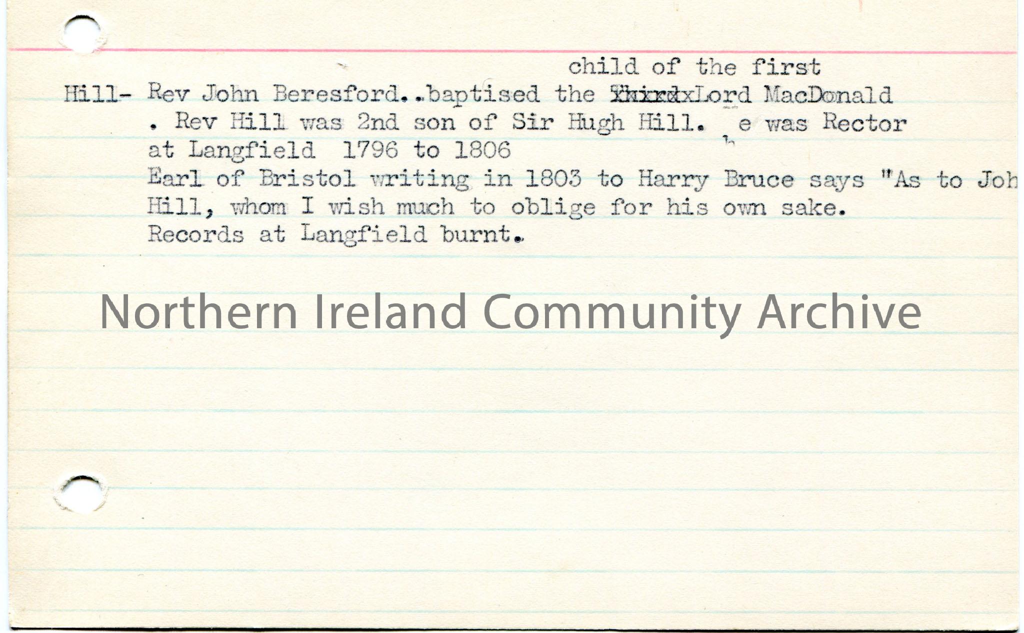 Typed notes on lined card re Rev Hill, Rev John Beresford. Mentions Earl of Bristol and Harry Bruce.