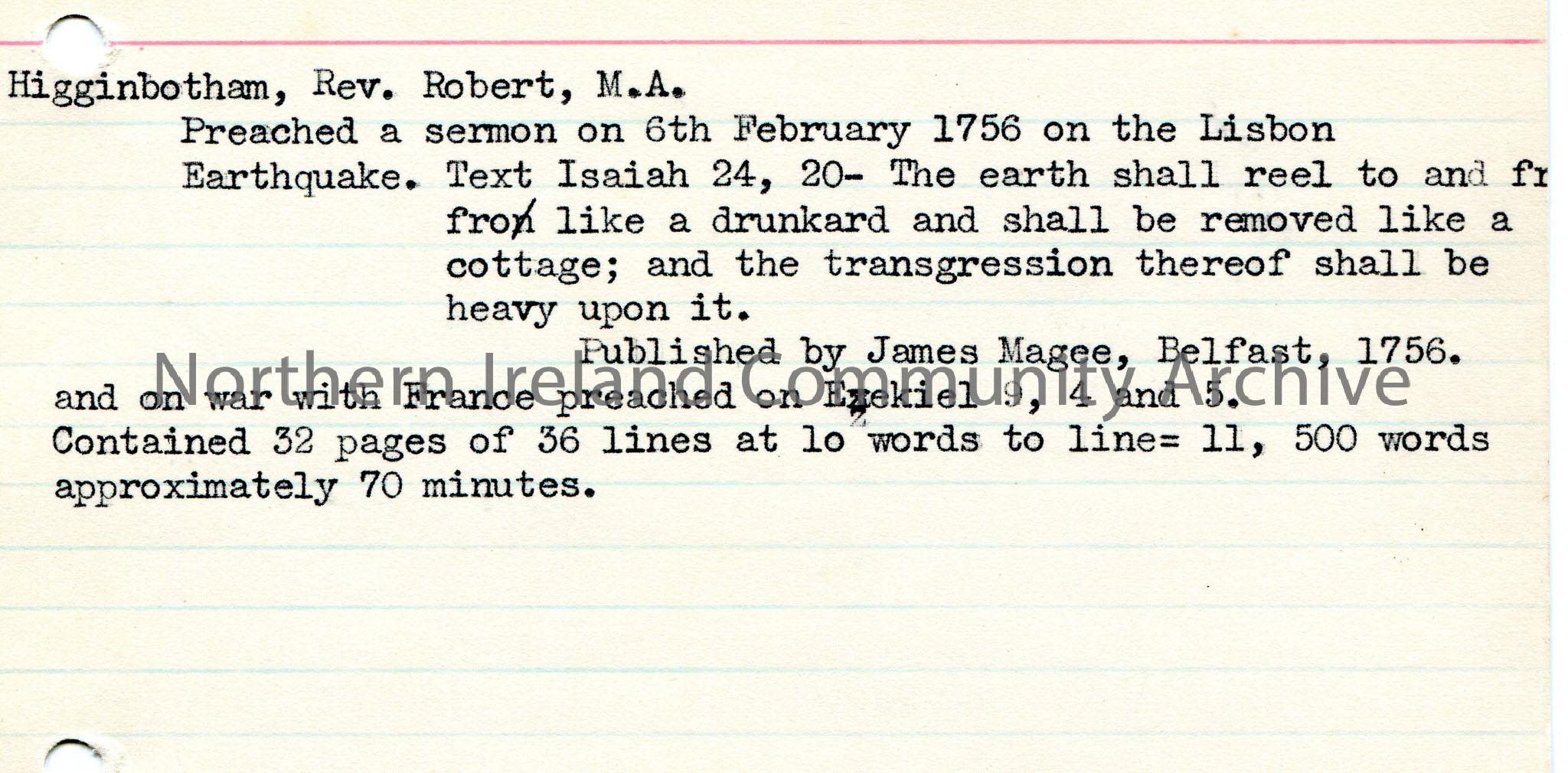 Typed notes on lined card re Rev Robert Higginbotham, M.A. Re a sermon on 6th February 1756 on the Lisbon earthquake.