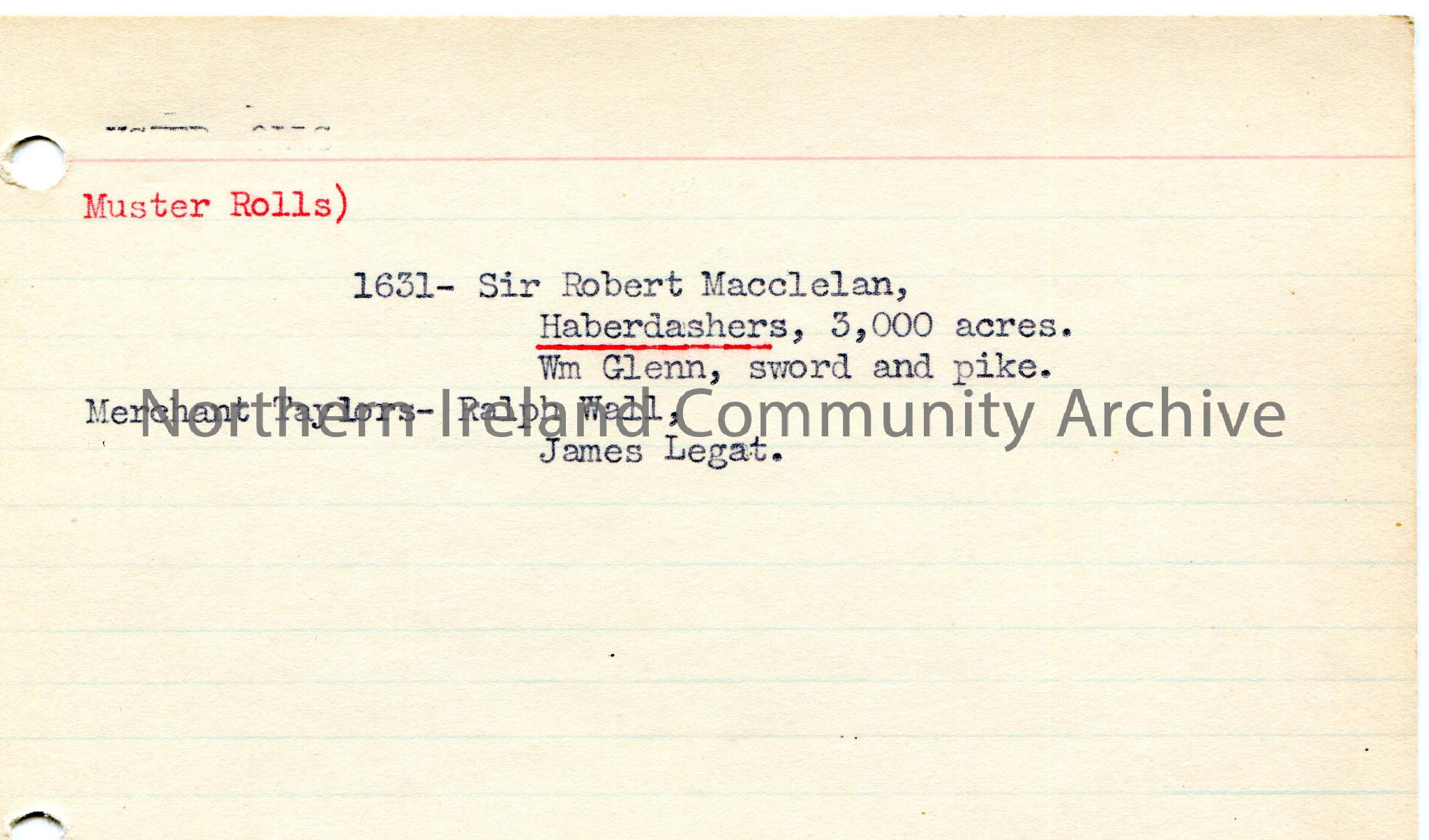 Typed notes on lined card re Sir Robert Macclelan.