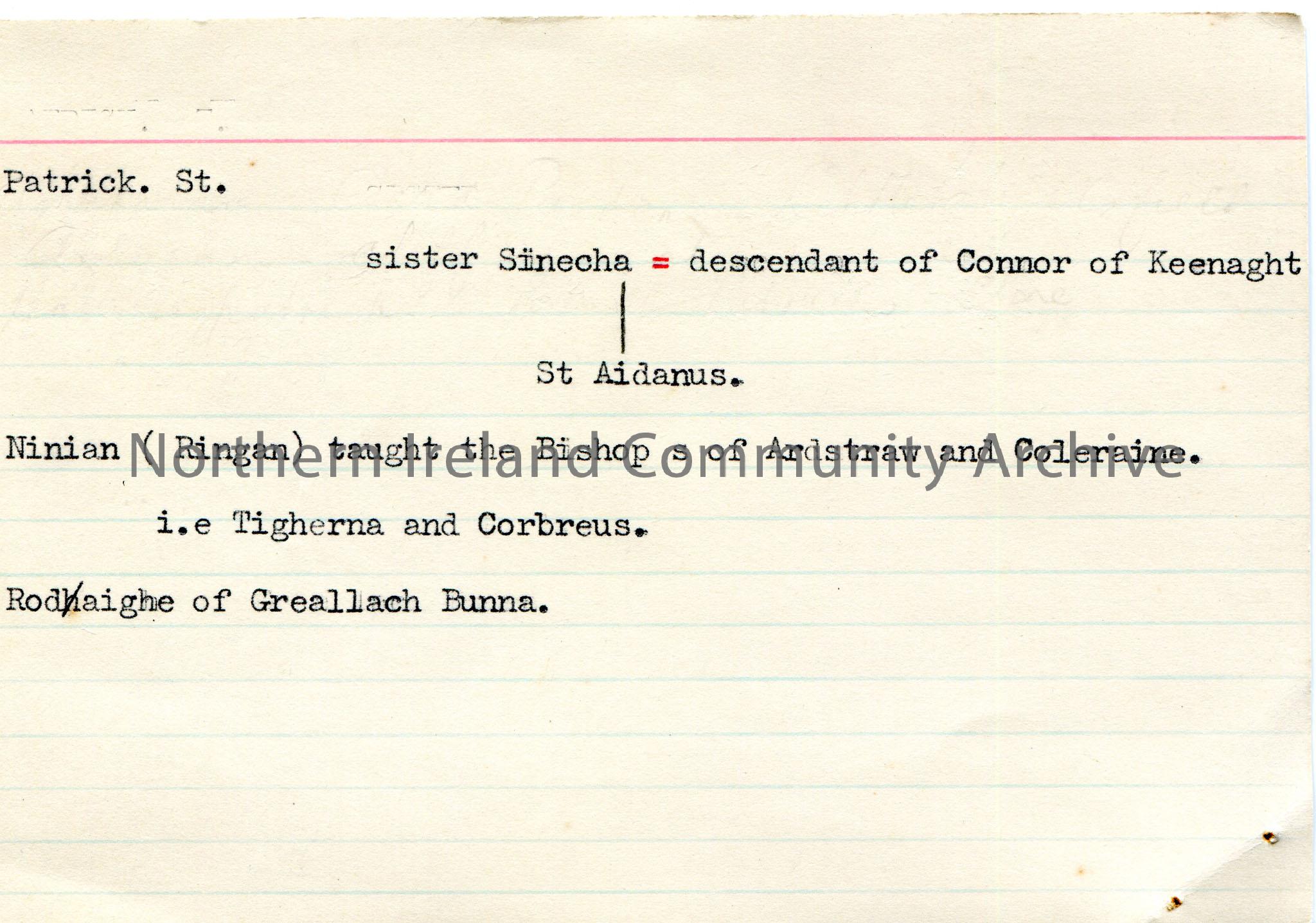 Typed notes on lined card re St. Patrick. Mentions Bishop of Ardstraw of Coleraine.
