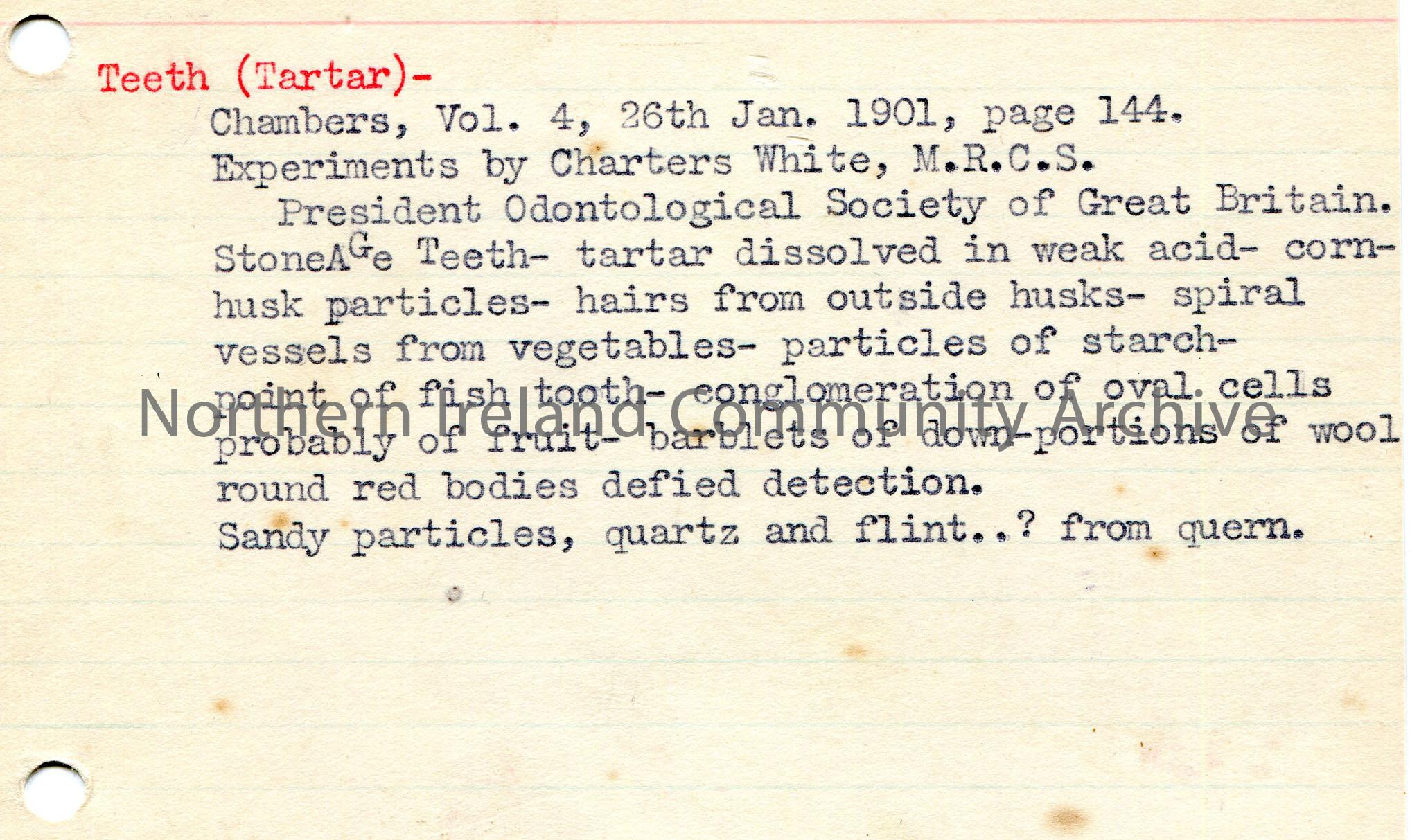 Typed notes on lined card re Stone Age Teeth.