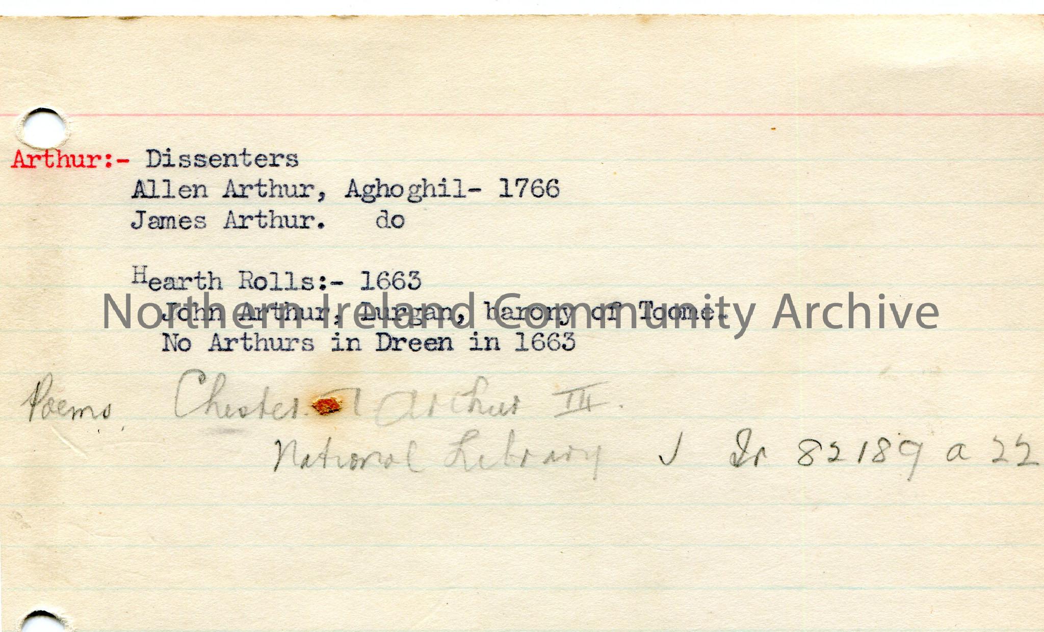 Typed notes on lined card re surname Arthur. Handwritten notes in pencil re Charles Arthur II.