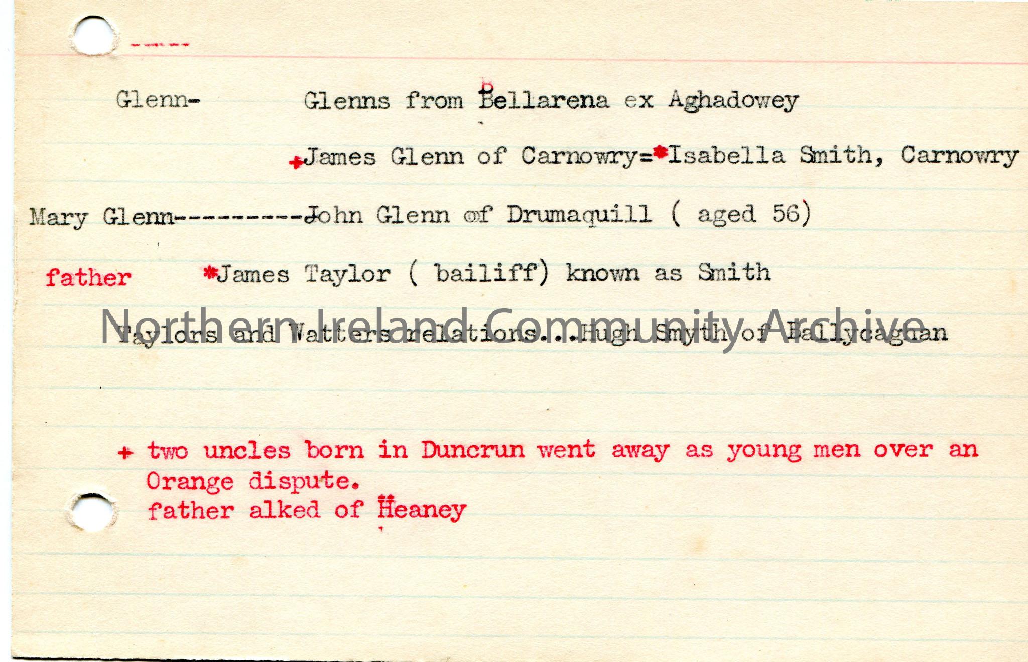 Typed notes on lined card re surname Glenn. Genealogical research. Mentions Glenns from Bellarena, James, Mary and John Glen.