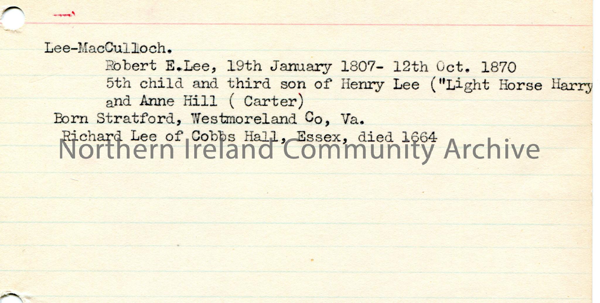 Typed notes on lined card re surname Lee MacCulloch. Genealogical information re Robert E. Lee.