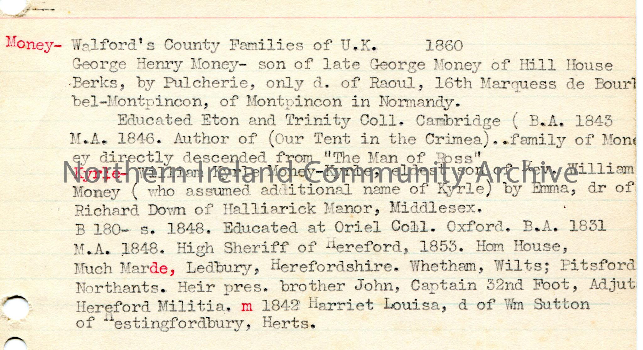 Typed notes on lined card re surname Money. Refers to George Henry Money and William Kyrle Money. Genealogical and education information.
