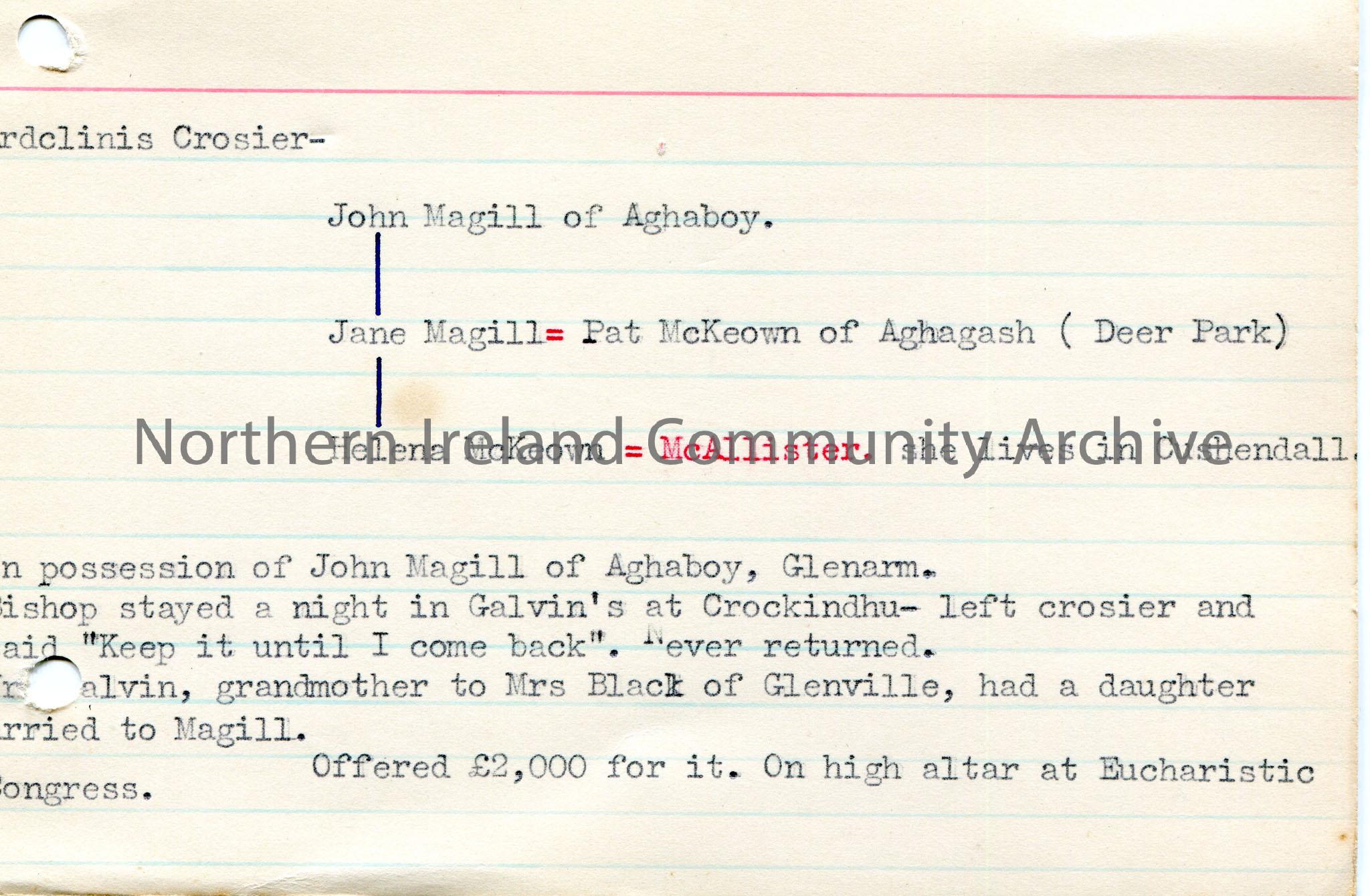 Typed notes on lined card re the family name Magill. Mentions Aghaboy, Aghagash, Cushendall, Glenville.