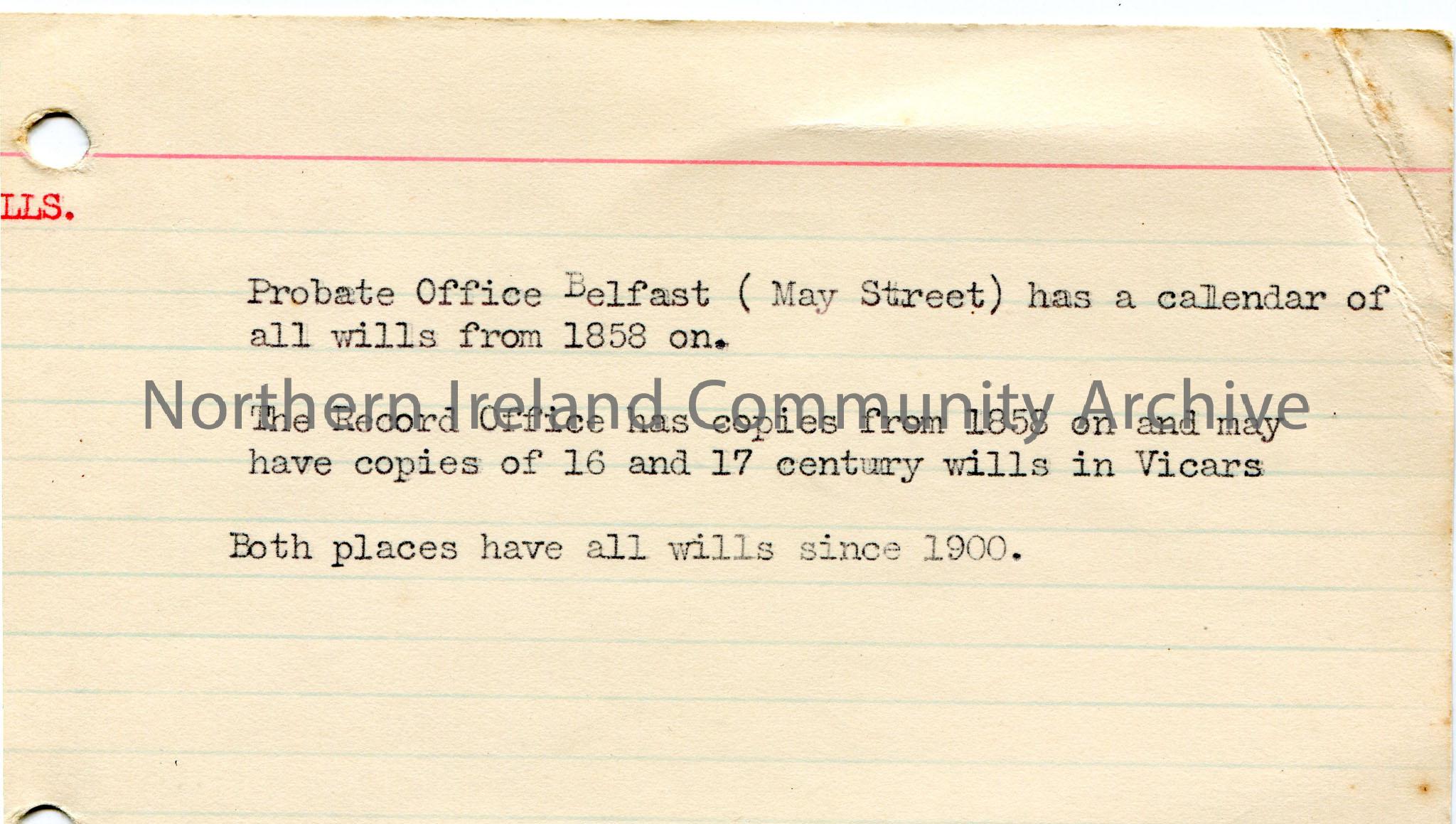 Typed notes on lined card re the location of records on wills. Mentions Belfast.
