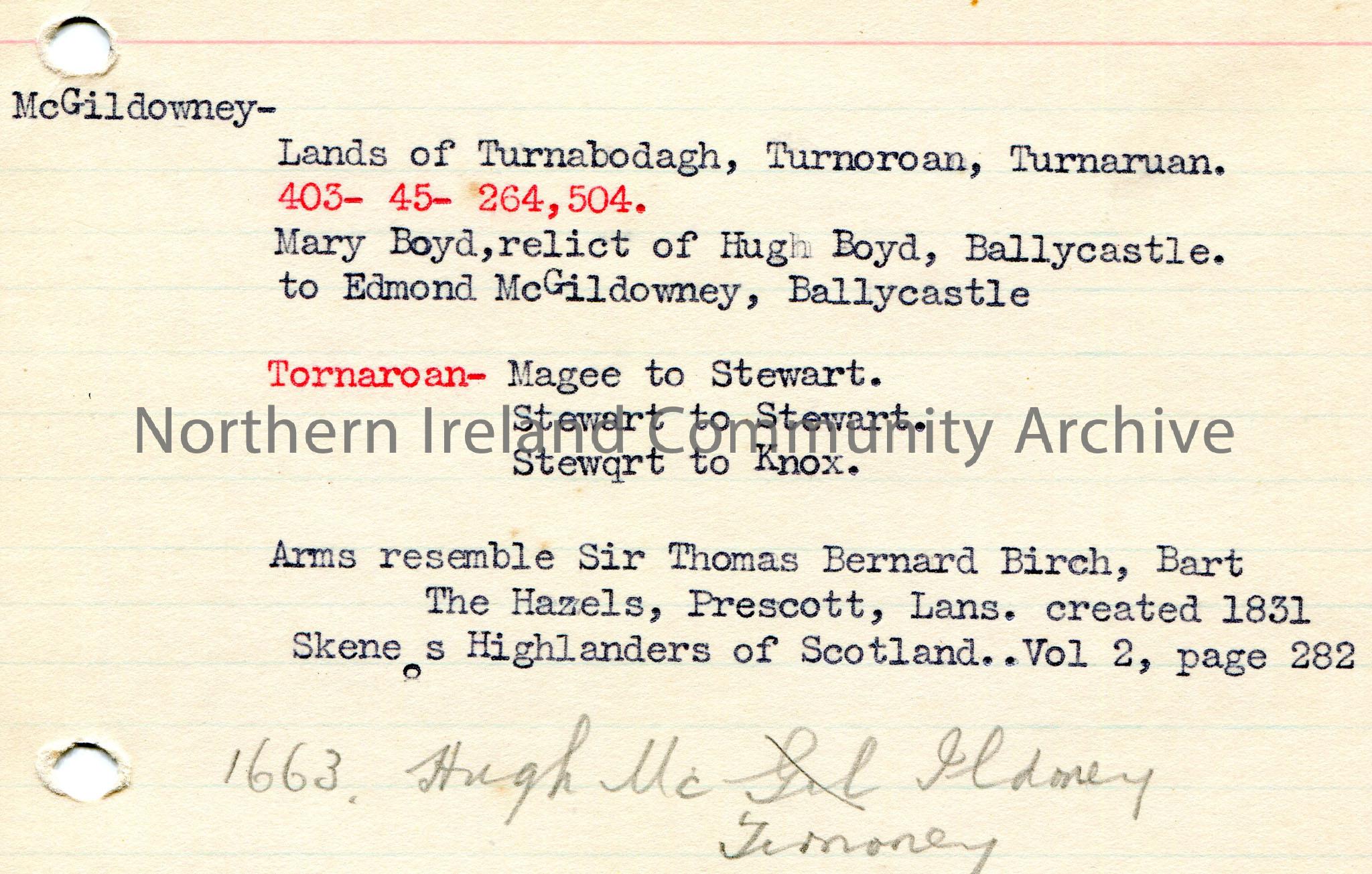 Typed notes on lined card re the surname McGildowney of Ballycastle. Handwritten note at bottom of card.