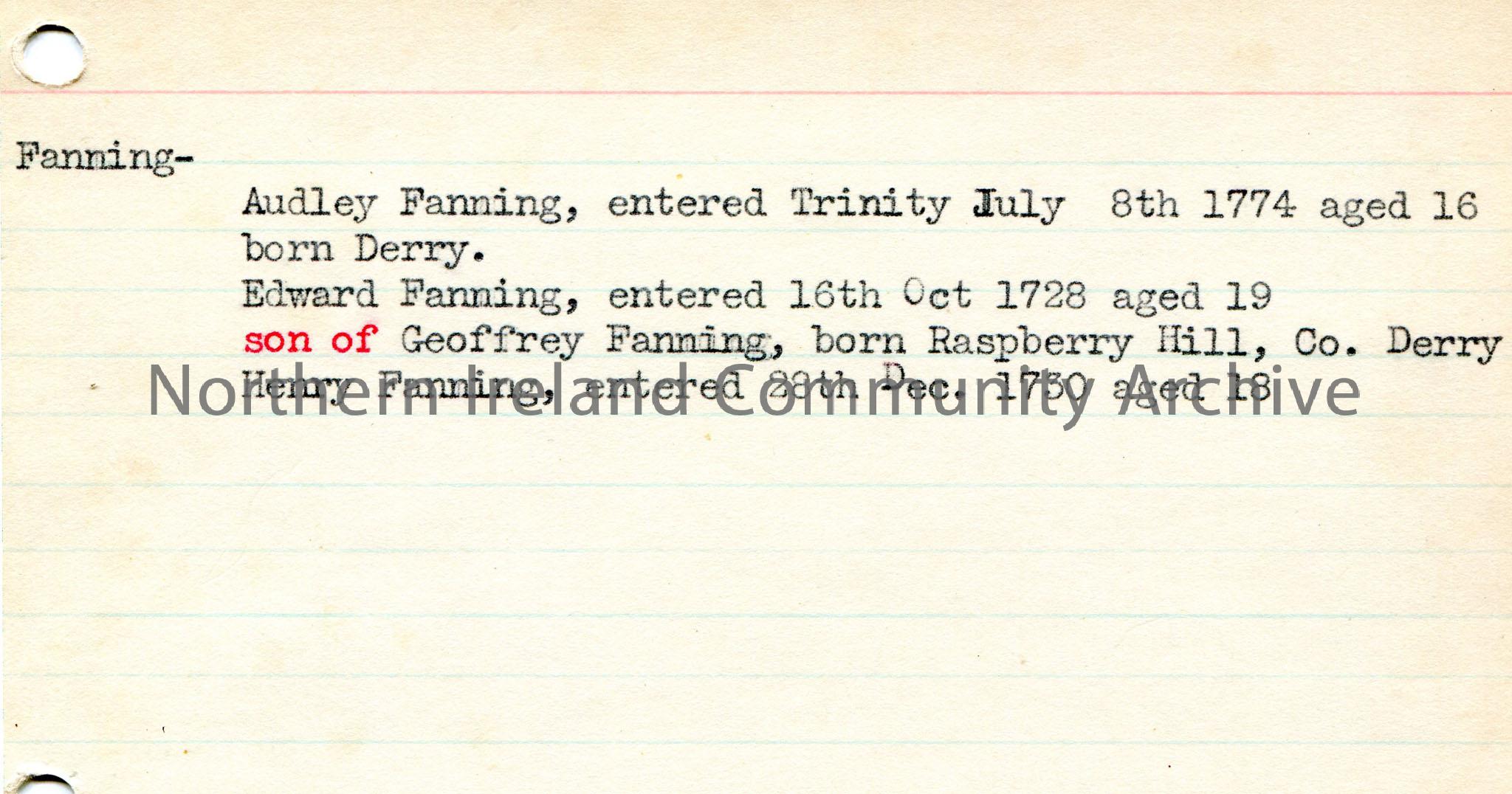 Typed notes on lined card re those with the surname Fanning who entered Trinity and the dates they entered.