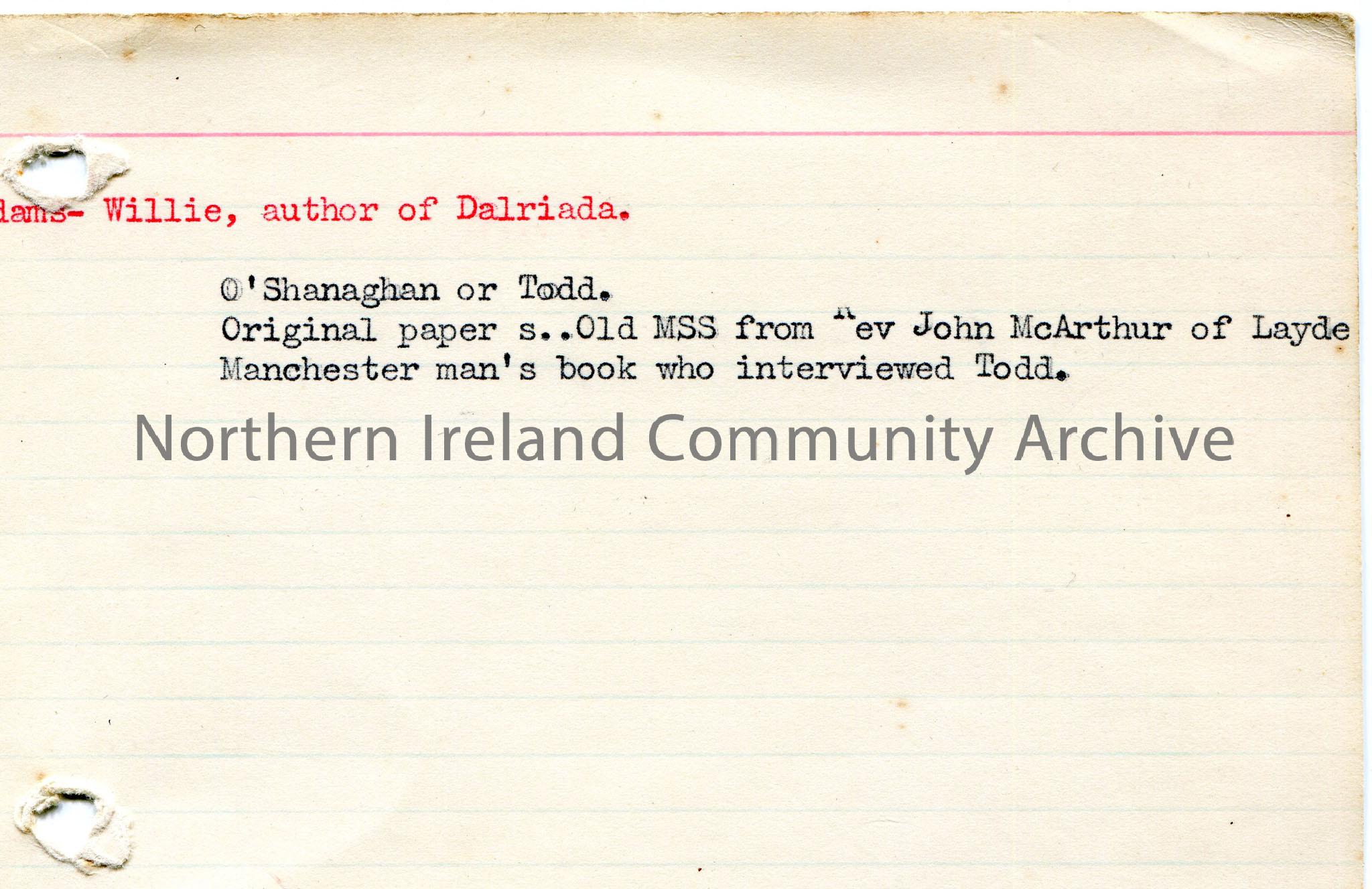 Typed notes on lined card re Willie Adams, author of Dalriada.