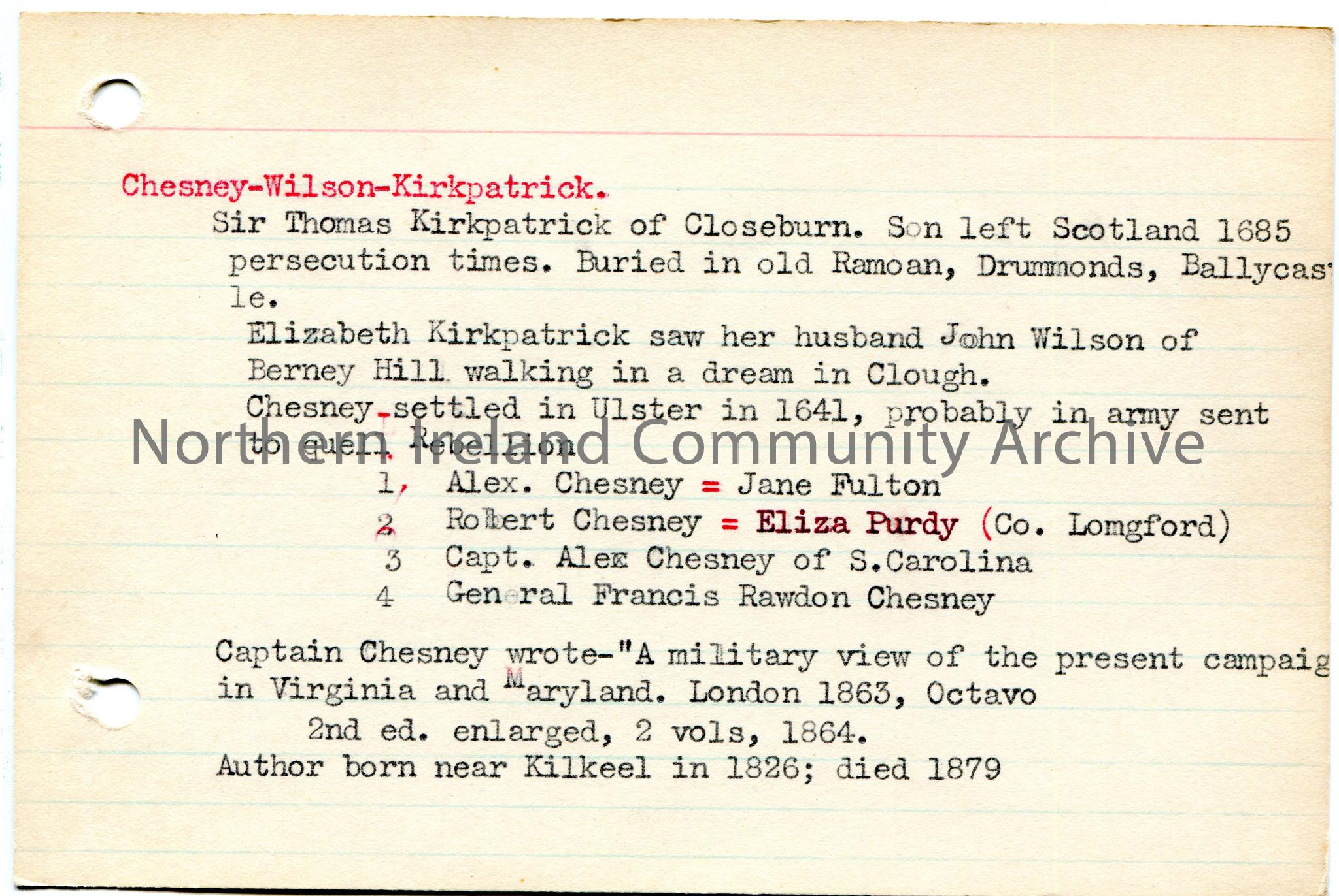 Typed notes on lined card titled, ‘Chesney-Wilson-Kirkpatrick’. Genealogy information on these family names.
