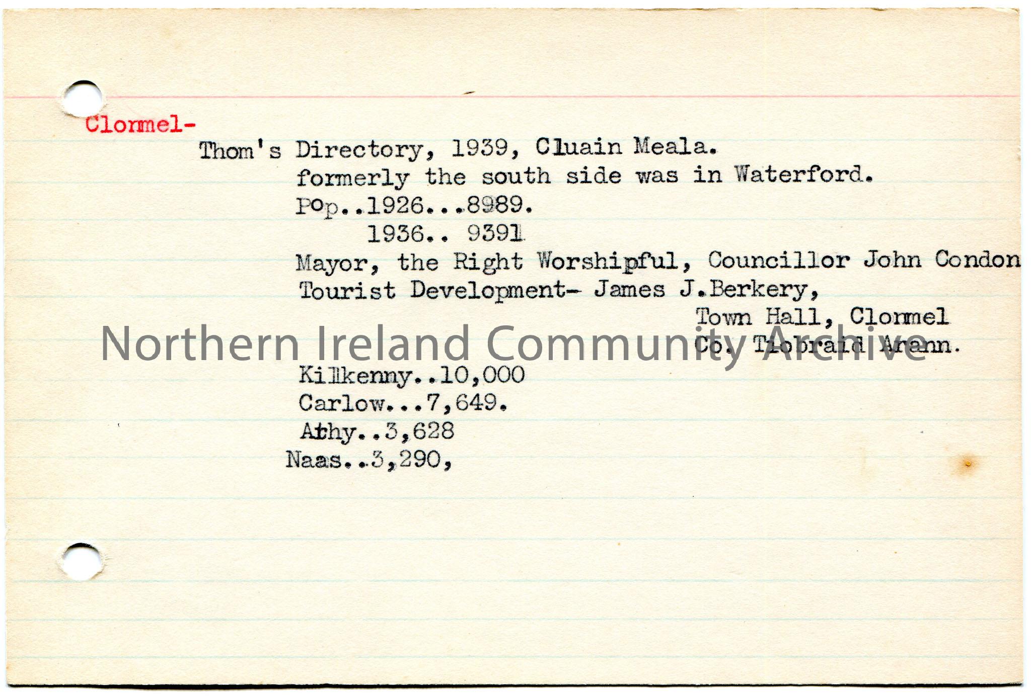 Typed notes on lined card titled, ‘Clomel’. Notes the population of towns in Ireland in 20th century.