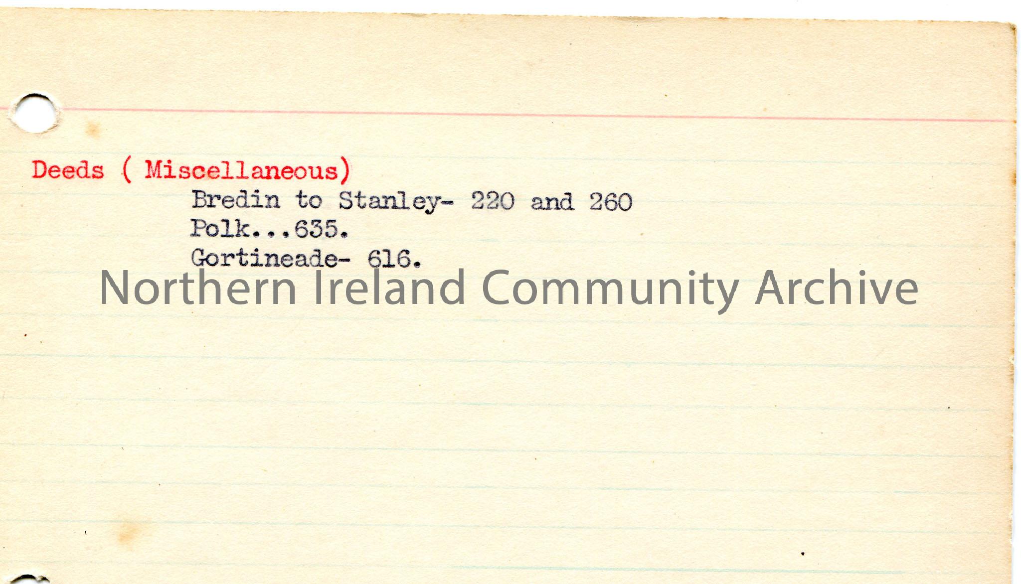 Typed notes on lined card titled, ‘Deeds (Miscellaneous)’.