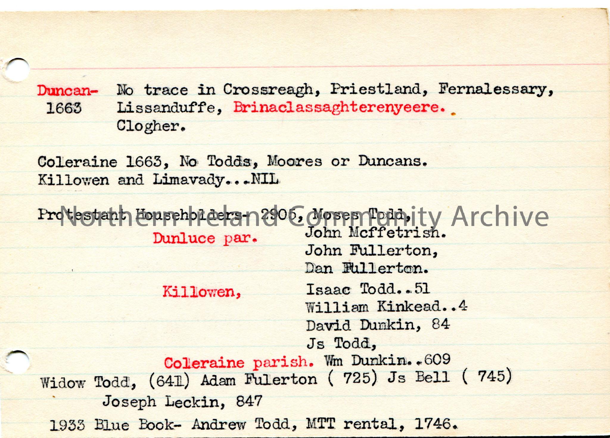 Typed notes on lined card titled, ‘Duncan’. Genealogical interest in the names Todd, Moore, Duncan. List of Protestant householders in Dunluce, Killow…