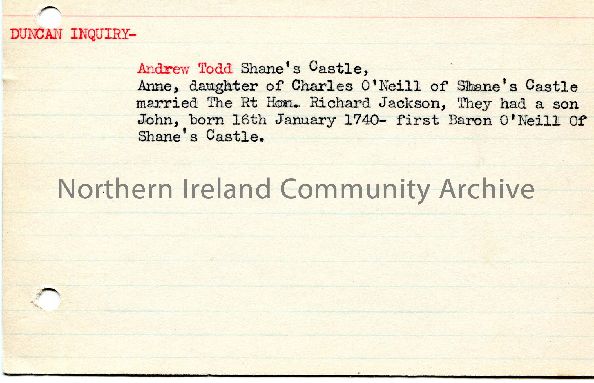 Typed notes on lined card titled, 'Duncan Inquiry'. Mentions Andrew Todd, Shane's Castle, Charles O'Neill, Richard Jackson.