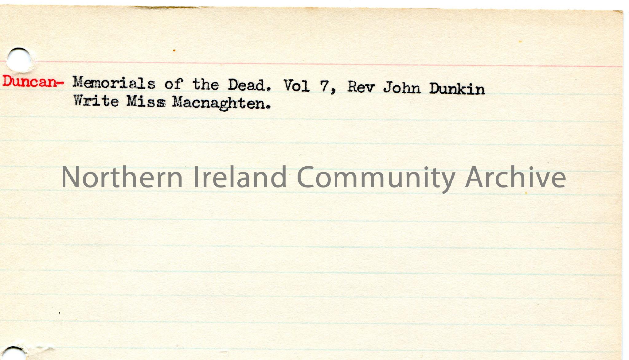 Typed notes on lined card titled, ‘Duncan’. Mentions Memorials of the Dead, Vol 7, Rev John Dunkin, Miss Macnaghten.