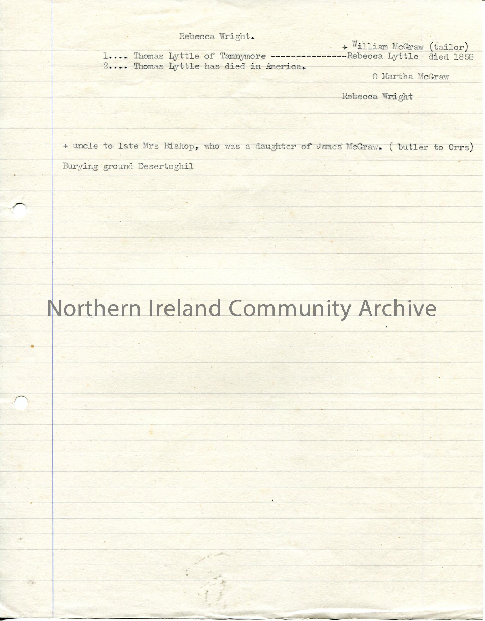 Typed notes on lined page re a genealogy inquiry by Mrs Rebecca Wright of Glenkeen, Aghadowey. Contains information re Thomas Lyttle of Tamnymore and McGraw family name.