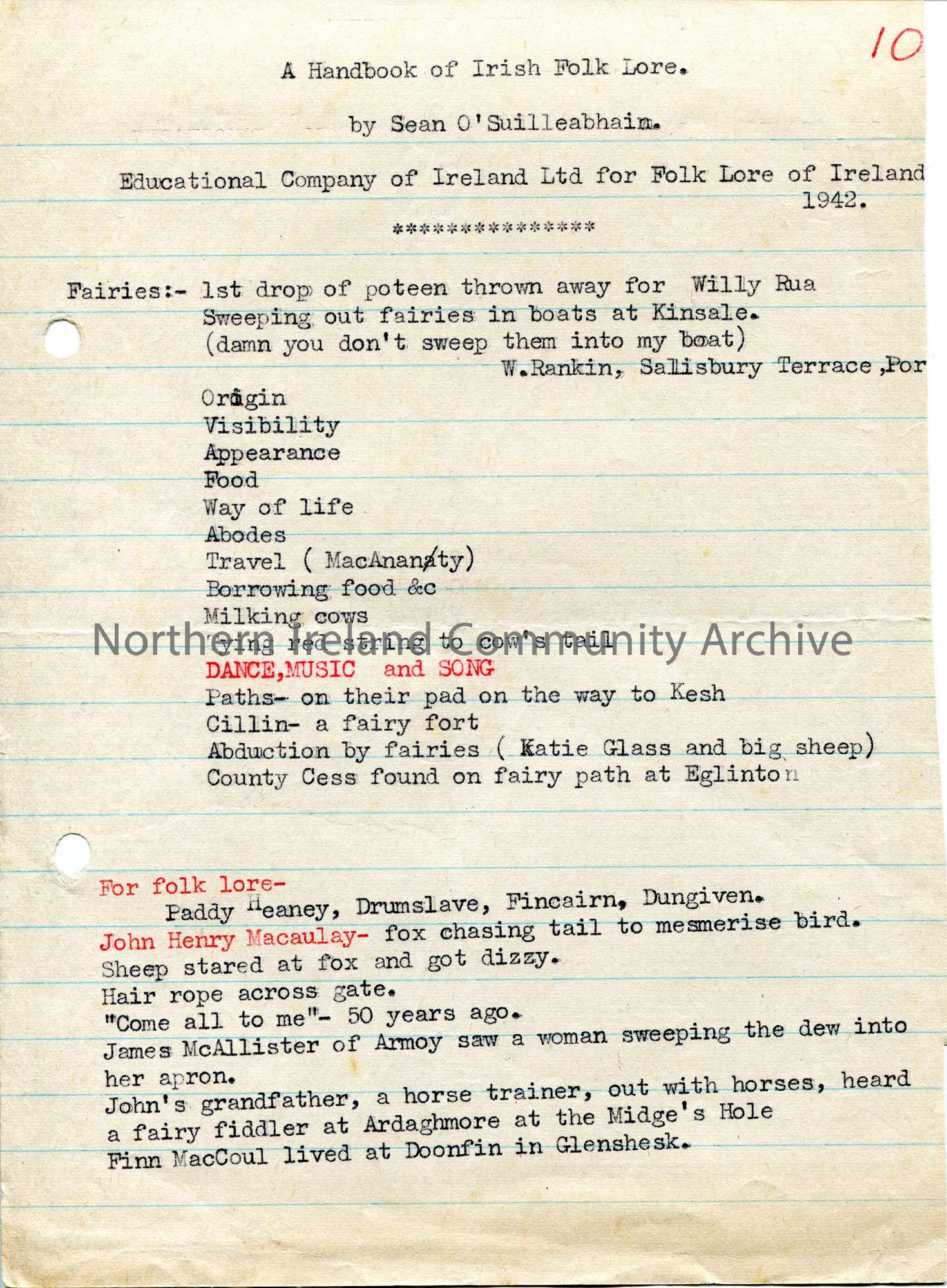 Typed notes on lined paper 'A Handbook of Irish Folk Lore by Sean O'Suilleabhain. Educational Company of Ireland Ltd for Folk Lore of Ireland, 1942'. Re fairies. Mentions John Henry Macaulay.