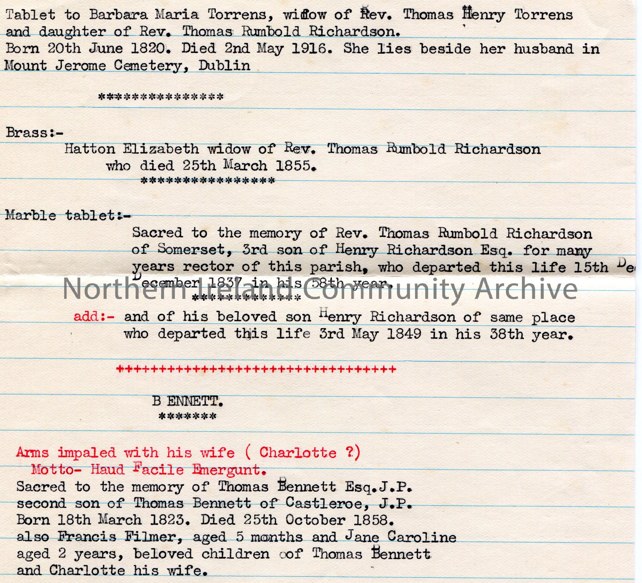 Typed notes on lined paper. Grave inscription of name Torrens at Mount Jerome Cemetery, Dublin. Mentions genealogical information re Rev Thomas Rumbold Richardson and Thomas Bennett.