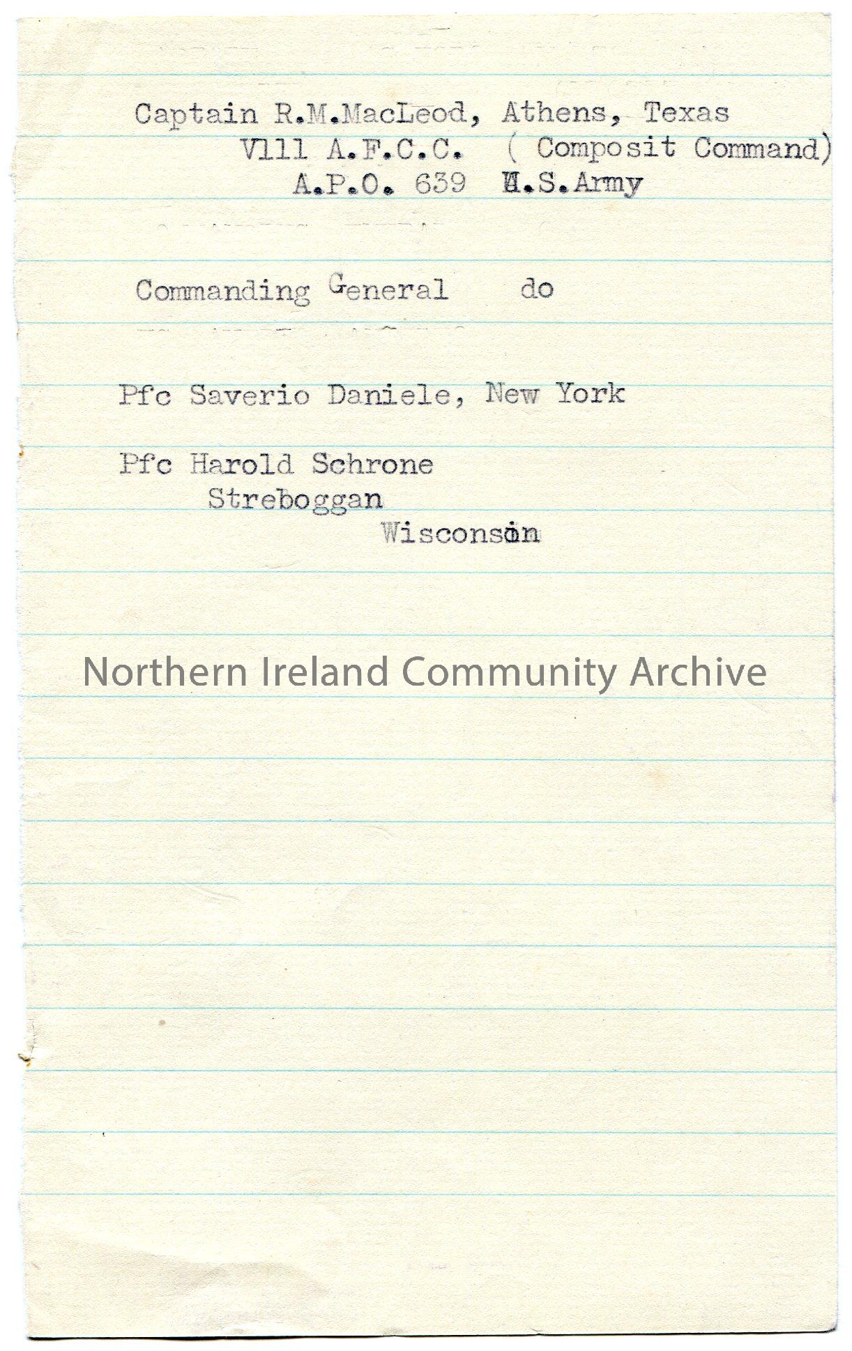 Typed notes on lined paper. Not in context. Mention Captain R.M.MacLeod; Professor Saverio Daniele, New York and Professor Harold Schrone, Streboggan.