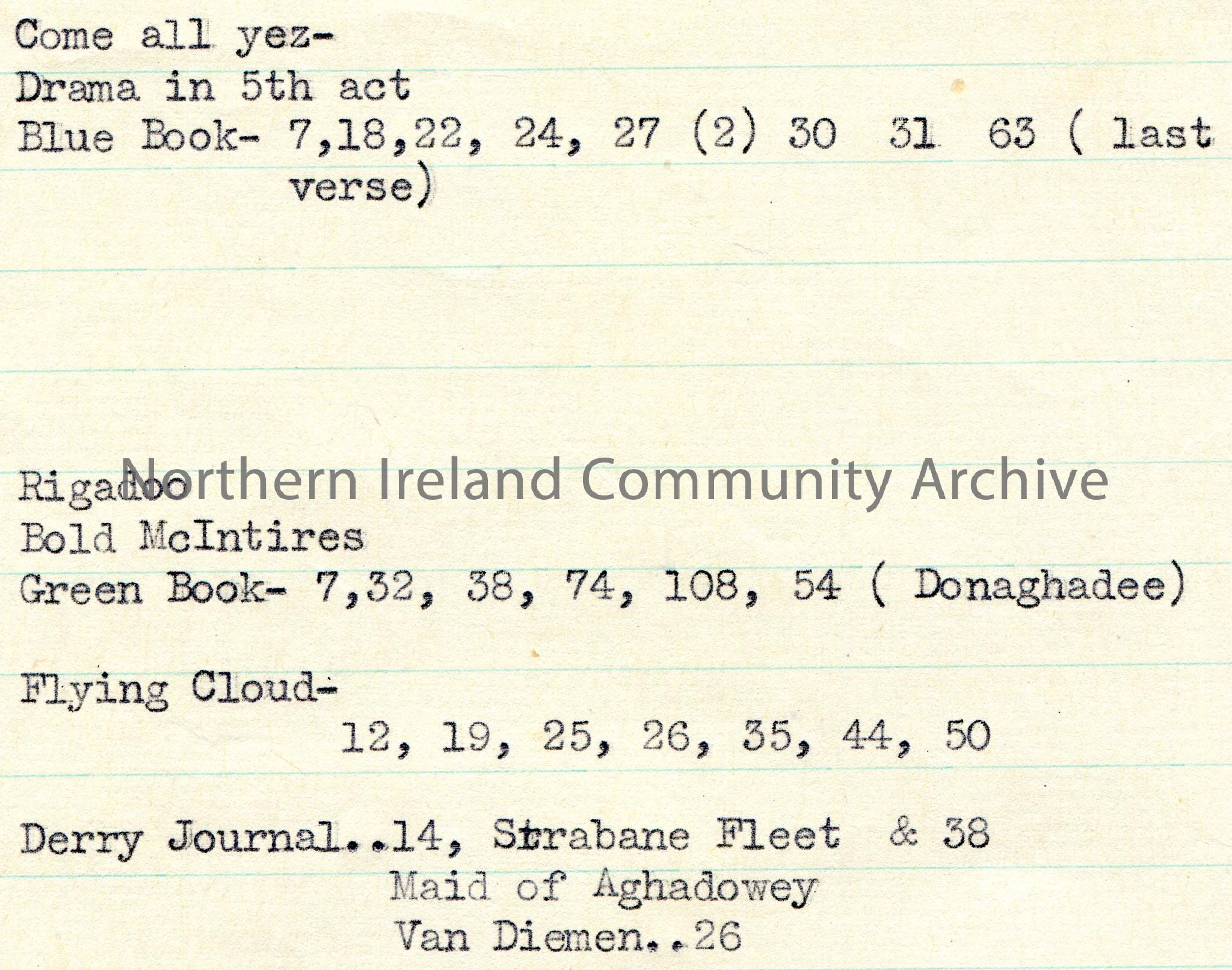 Typed notes on lined paper. Notes note in context. Possible song numbers taken from books - Blue Book, Green Book, Derry Journal. Mentions 'Strabane Fleet', 'Maid of Aghadowey', 'Van Diemen' and Donaghadee.