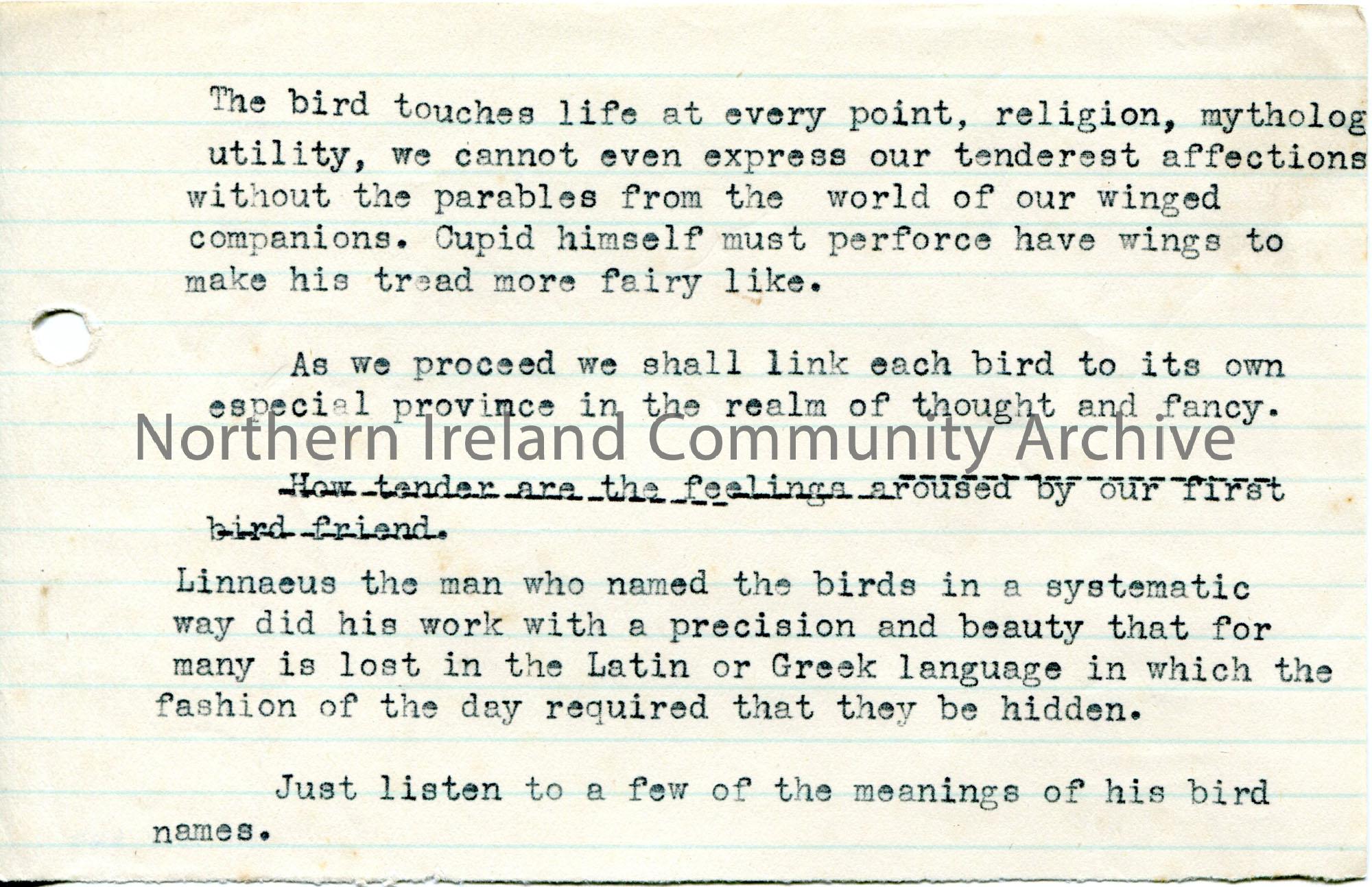 Typed notes on lined paper re birds. Refers to [Carl] Linnaeus [known for identification and naming of animals, plants, bacteria, fungi, etc].