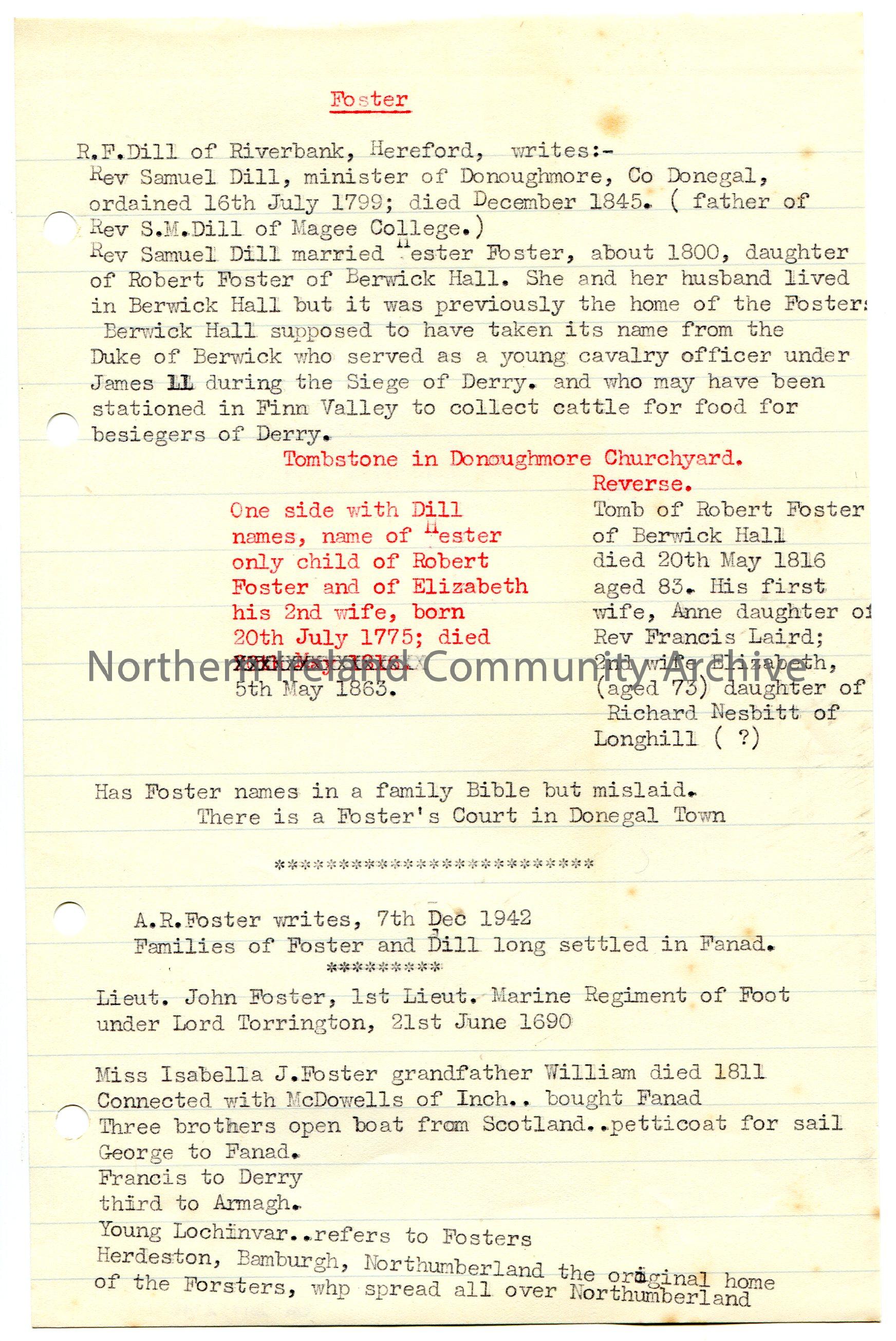 Typed notes on lined paper re Foster family genealogy. Notes titled, 'Foster'. Inscription from tombstone in Donoughmore Churchyard - one side has surname of Dill and other side Foster.