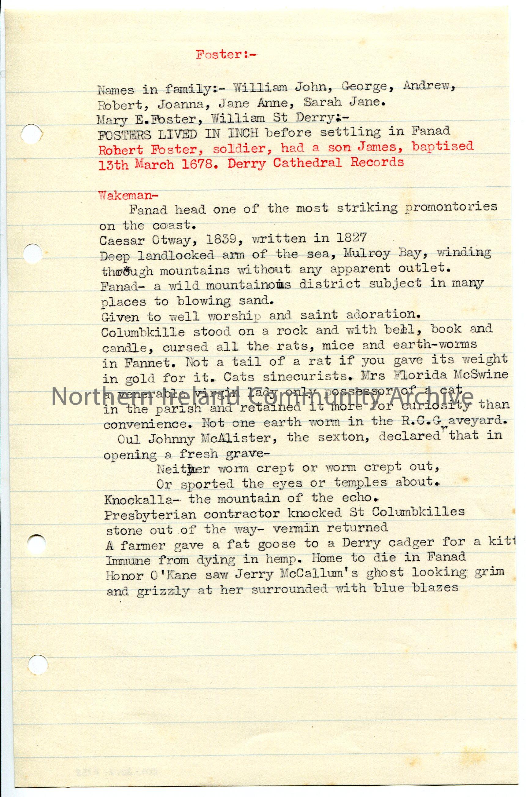 Typed notes on lined paper re Foster family. Notes the names in the family. Typed note re Robert Foster in red ink. Other notes titled, 'Wakeman'. Not in context. Mentions a cat in a Parish.